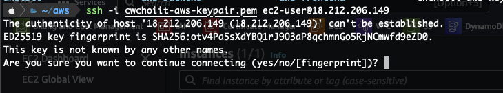만든 key pair로 EC2 인스턴스에 연결했으니 사용해서 접속을 해보면 다음과 같은 문구가 나온다. 여기서 'yes'를 입력.