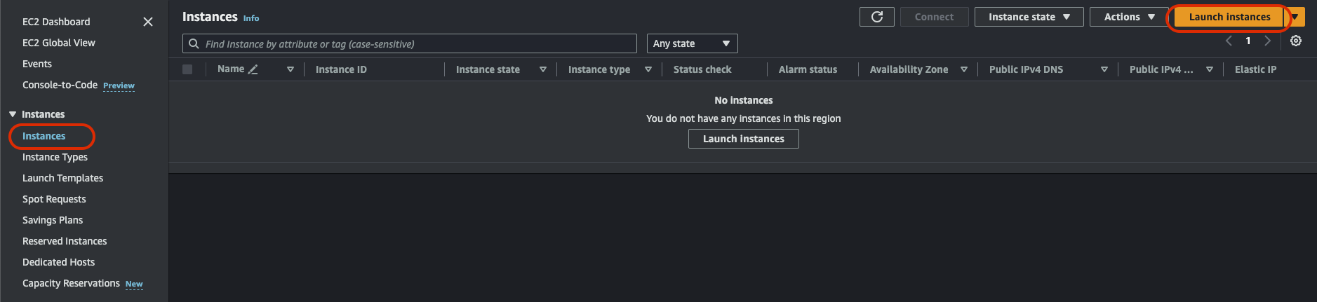 EC2 서비스에 들어오면 좌측 Instances 섹션에 Instances 버튼 클릭 후 화면 진입해서 우측 상단 Launch instances 클릭