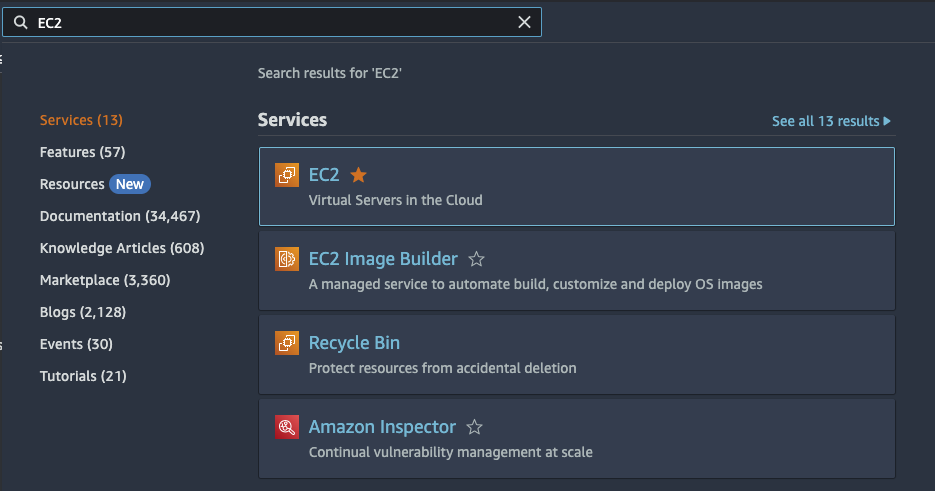AWS Console에서 EC2를 검색해서 서비스를 찾는다.