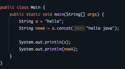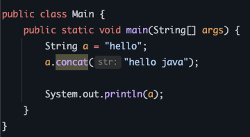 그리고 저번 포스팅에서 다룬 불변객체가 값을 바꿀 땐 새로운 불변객체를 만들어낸다고 했는데 그것을 String 클래스에서도 확인할 수 있다. 다음 코드를 보자. 문자열을 합치는 concat() 메서드를 사용했지만 다음 코드는 전혀 값의 변화가 없다.