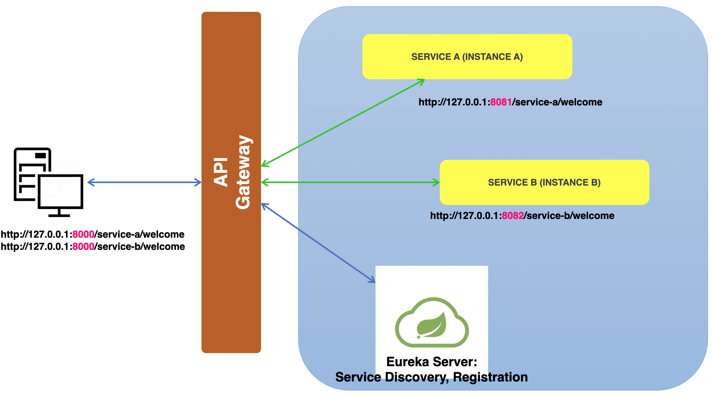 위 사진에서는 클라이언트에서 요청을 하는 게 첫 번째 흐름인데 요청을 SERVICE A 또는 SERVICE B에 직접적으로 하는 게 아닌 중간에 있는 API Gateway에게 요청한다. API Gateway 역시 Microservice가 된다. API Gateway는 외부의 모든 요청을 이 녀석이 책임지고 받아 이 요청을 처리할 수 있는 서비스를 찾아서 그 서비스에게 돌려주는 Service Discovery Server(Netflix Eureka)에게 전달한다.