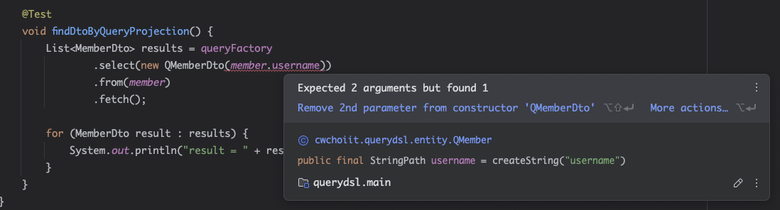 - 위와 다른 것은 Projections.fields(...)를 사용했다는 점이다. 이 방법은 필드에 직접적으로 값을 넣어준다. DTO 클래스에 필드들은 다 private으로 선언했지만? 알다시피 리플렉션은 private도 접근 가능하게 해버릴 수 있기 때문에 상관없다.