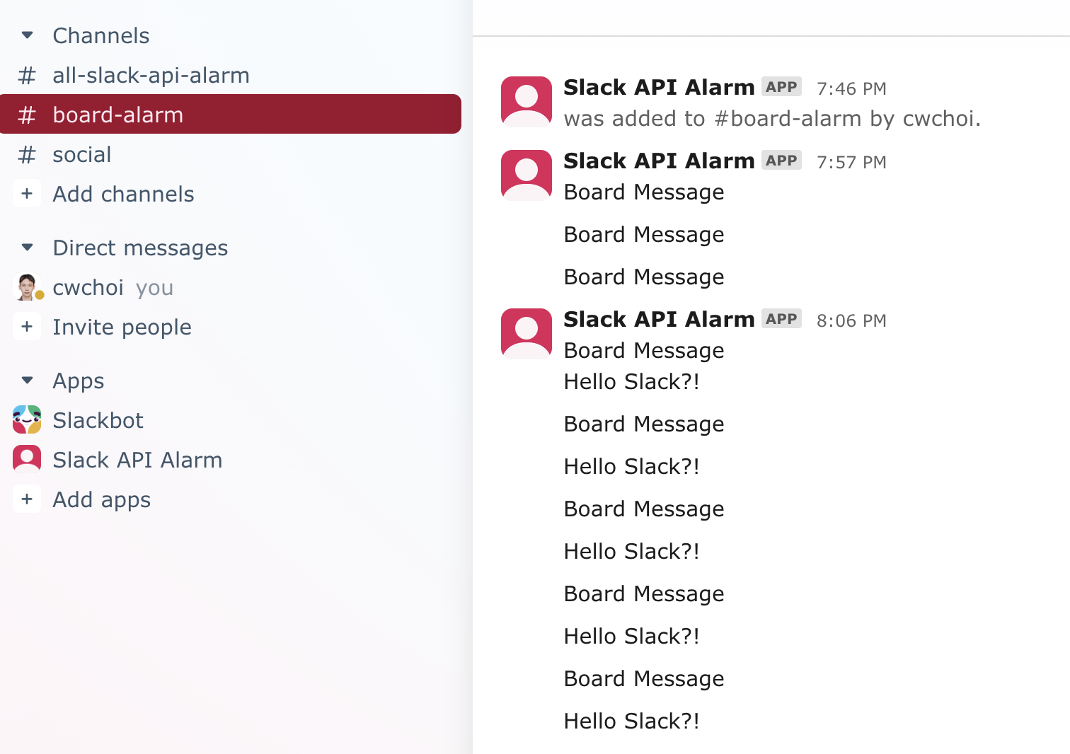 SlackMessageRequest.of("Board Message\n\nHello Slack?!", SlackMessageRequest.Channel.ERROR)