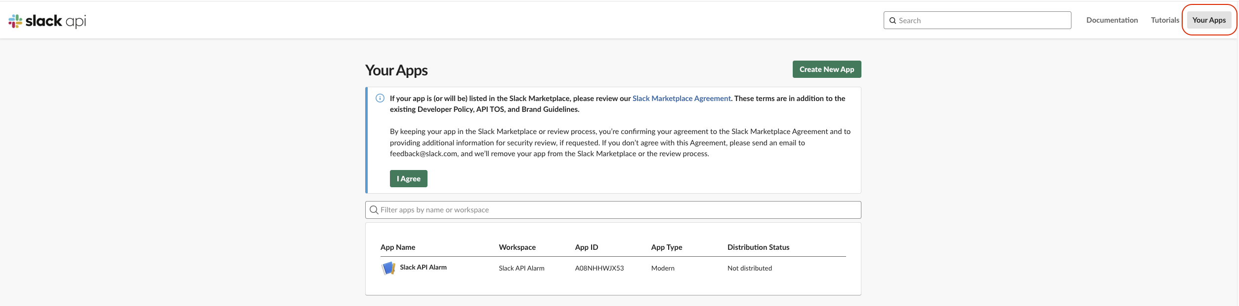 슬랙 API 사이트로 접속해서, [Your Apps] 클릭 후 새 앱을 만든다.