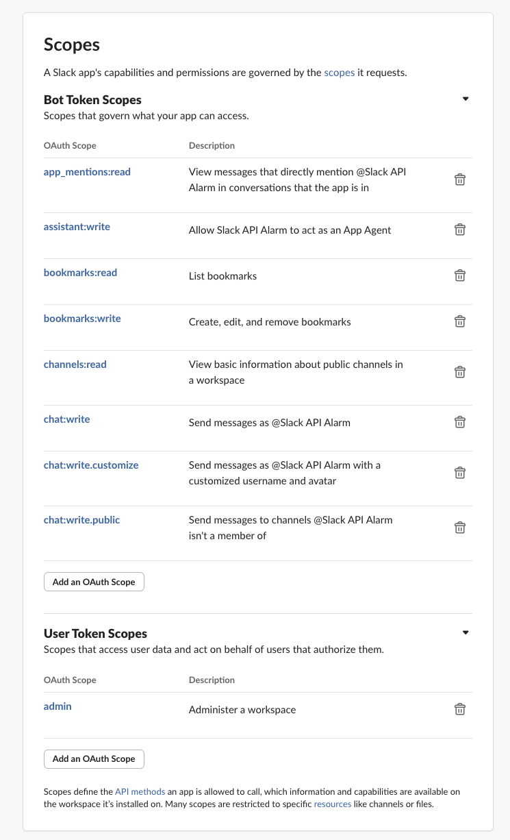 App Settings 에 들어와서, OAuth & Permissions 탭에 들어가면 Bot User OAuth Token을 생성하면 된다. 생성할 때 하단에 권한을 설정해주면 되는데, 원하는 권한을 부여하면 된다.