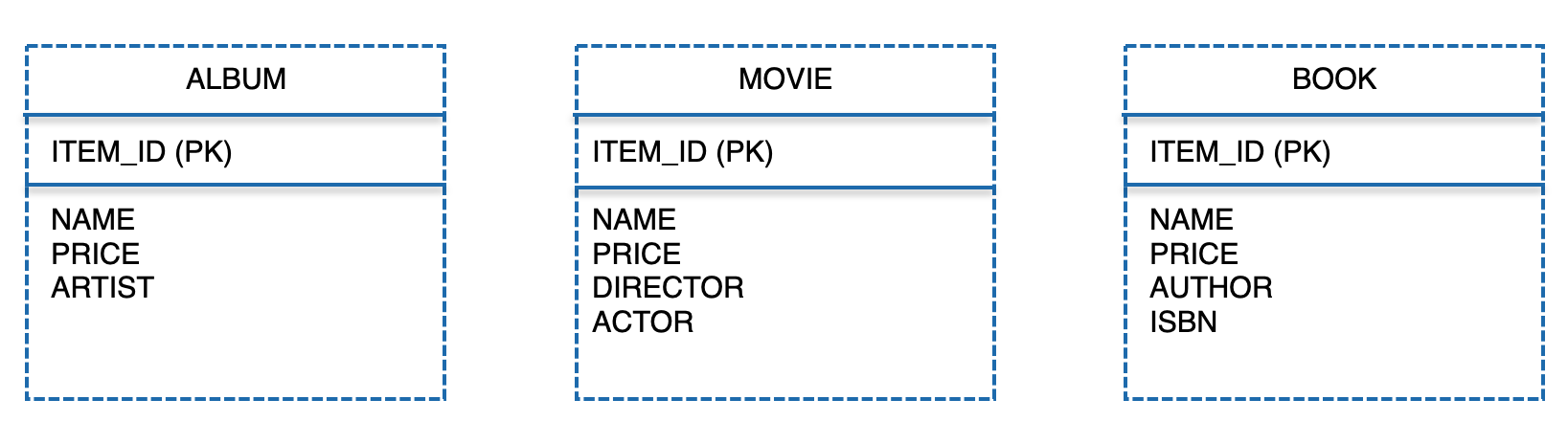 아이템 테이블을 아예 없애고, 아이템 테이블이 가지고 있는 필드들을 각 테이블 (Movie, Book, Album)이 모두 가지는 경우를 말한다.