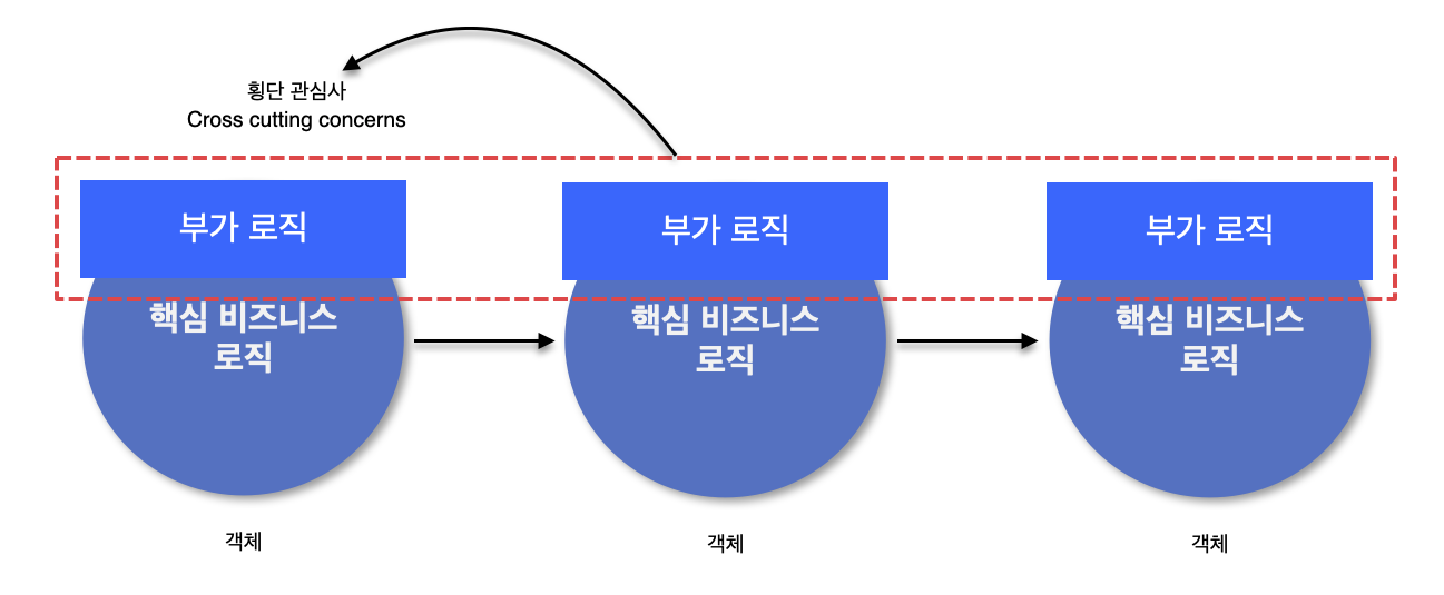 보통 부가 기능은 여러 클래스에 걸쳐서 함께 사용된다. 예를 들어서 모든 애플리케이션 호출을 로깅해야 하는 요구사항을 생각해보자. 이러한 부가 기능은 횡단 관심사(cross-cutting concerns)가 된다. 쉽게 이야기해서 하나의 부가 기능이 여러 곳에 동일하게 사용된다는 뜻이다.
