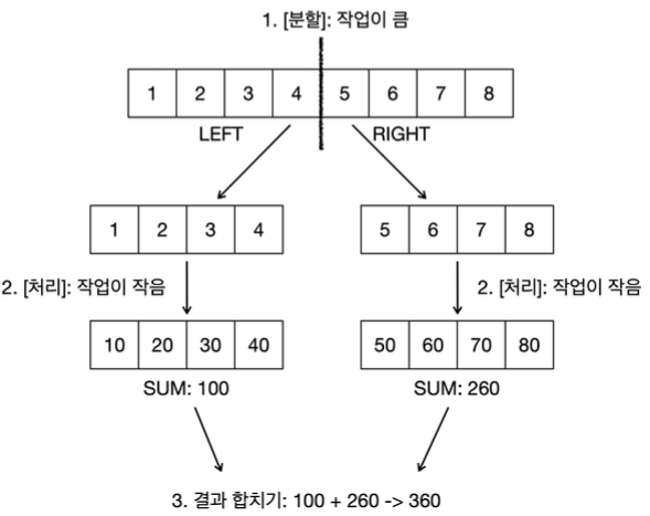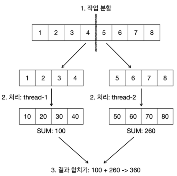 각 스레드는 한 번에 하나의 작업만 처리할 수 있다. 따라서, 1 ~ 8을 처리하는 큰 단위의 작업을 더 작은 단위의 작업으로 분할해야 한다. 여기서는 1 ~ 8의 큰 작업을 1 ~ 4, 5 ~ 8과 같이 절반으로 분할해서 두 개의 스레드로 처리해보자.