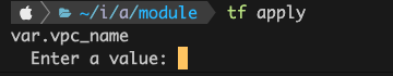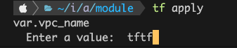 Apply를 실행해보자. 다음과 같이 변수 값을 받는다. 이는 vpc_name의 기본값을 설정해주지 않았기 때문이다.