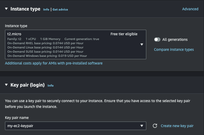 나머지 설정은 그대로 하고 Key pair는 위에서 사용한 그대로 사용한다.