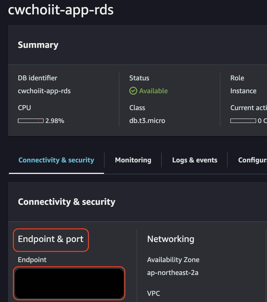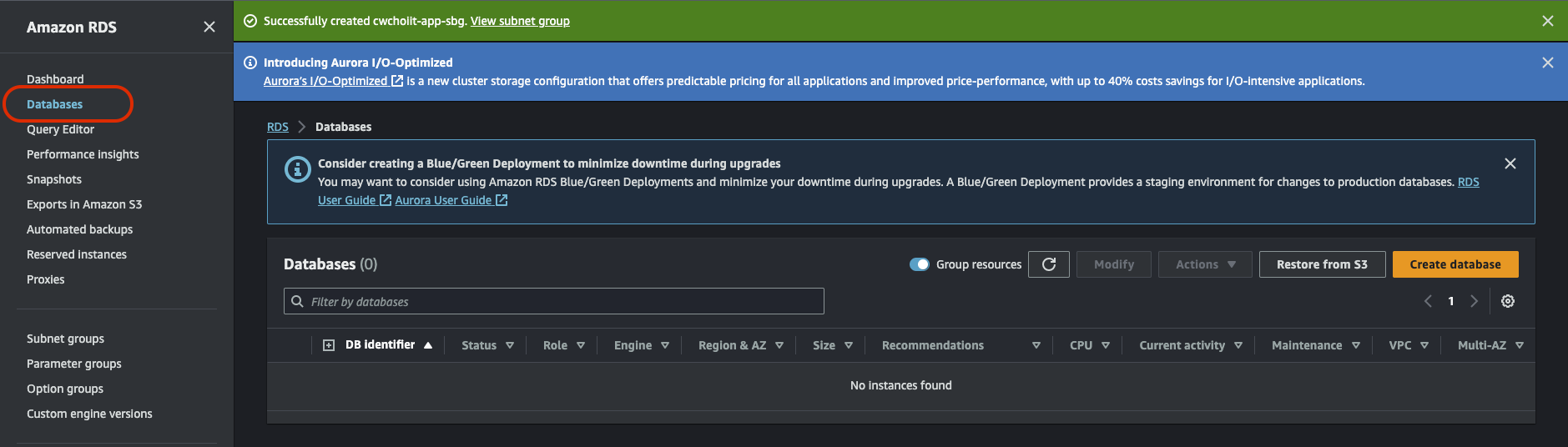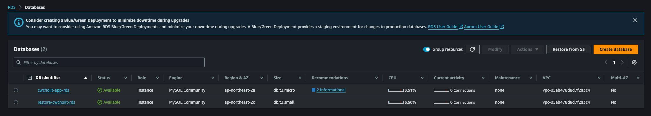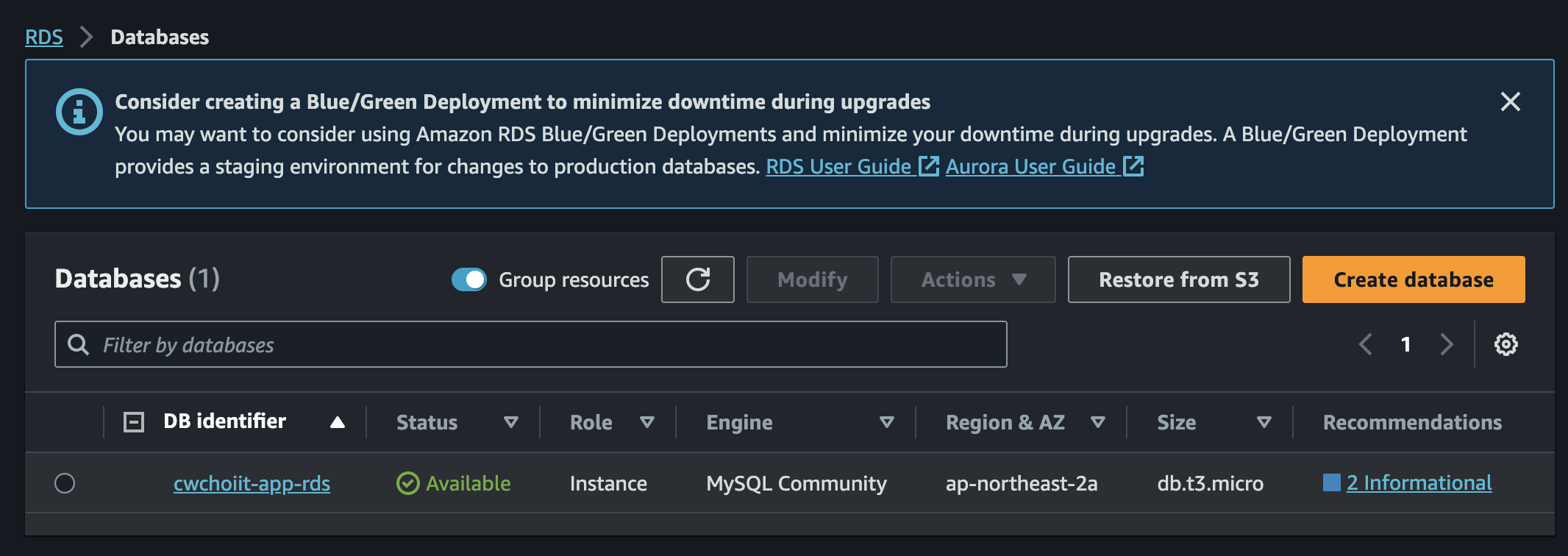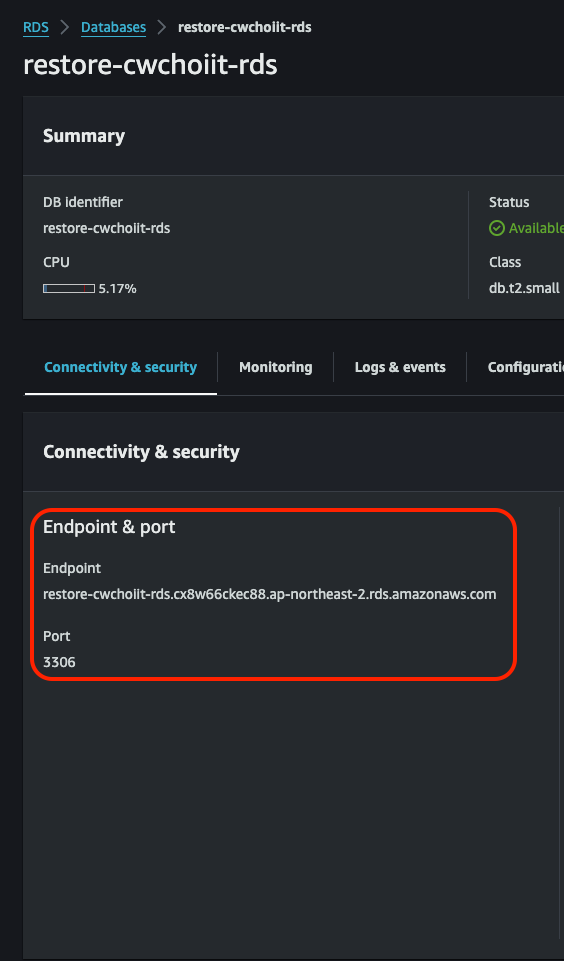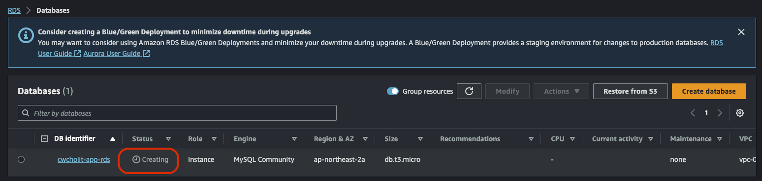 그리고 RDS 서비스 내 Databases 화면으로 가면 백업한 RDS가 생성됐음을 확인할 수 있다.