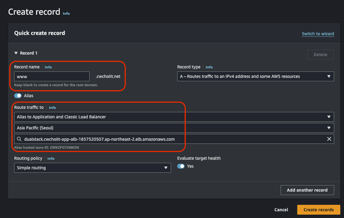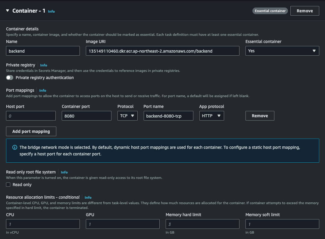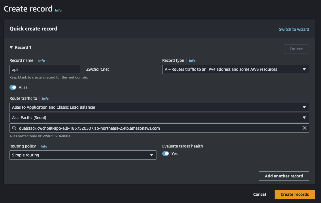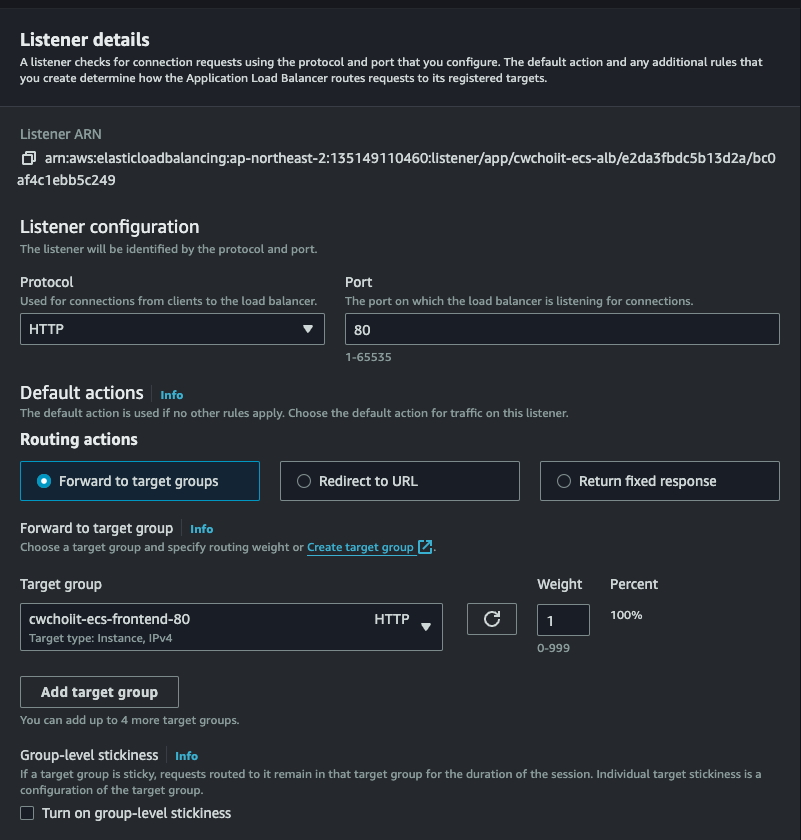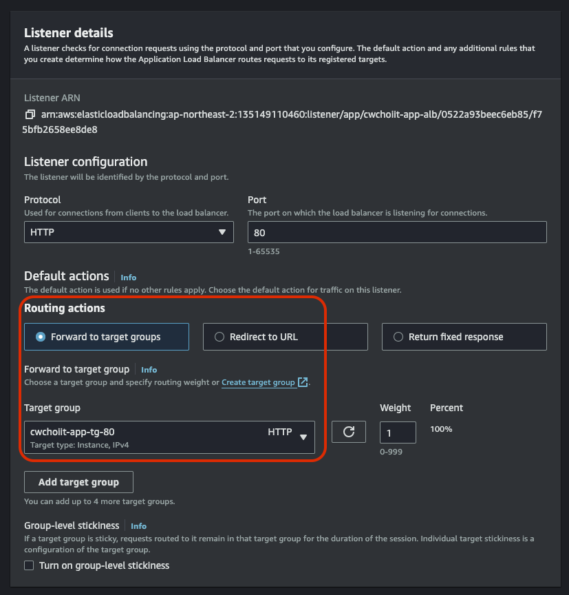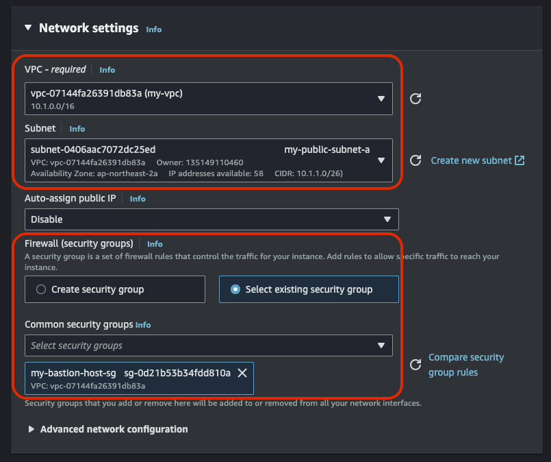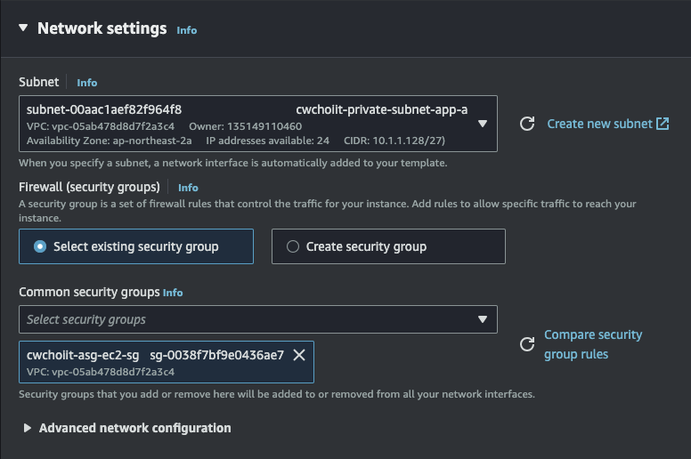 Network settings는 위에서 만든 VPC와 서브넷은 Public Subnet A로 설정하고 보안 그룹은 방금 막 만든 보안그룹으로 세팅한다.