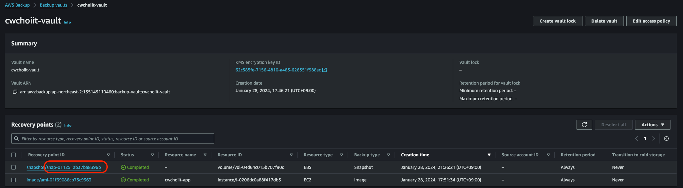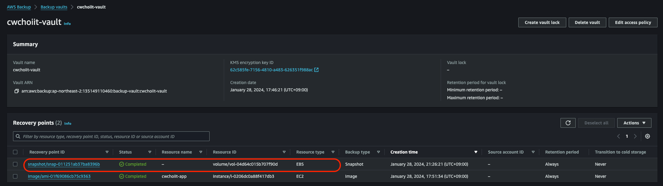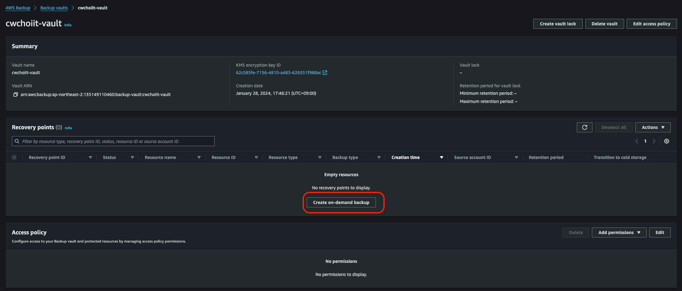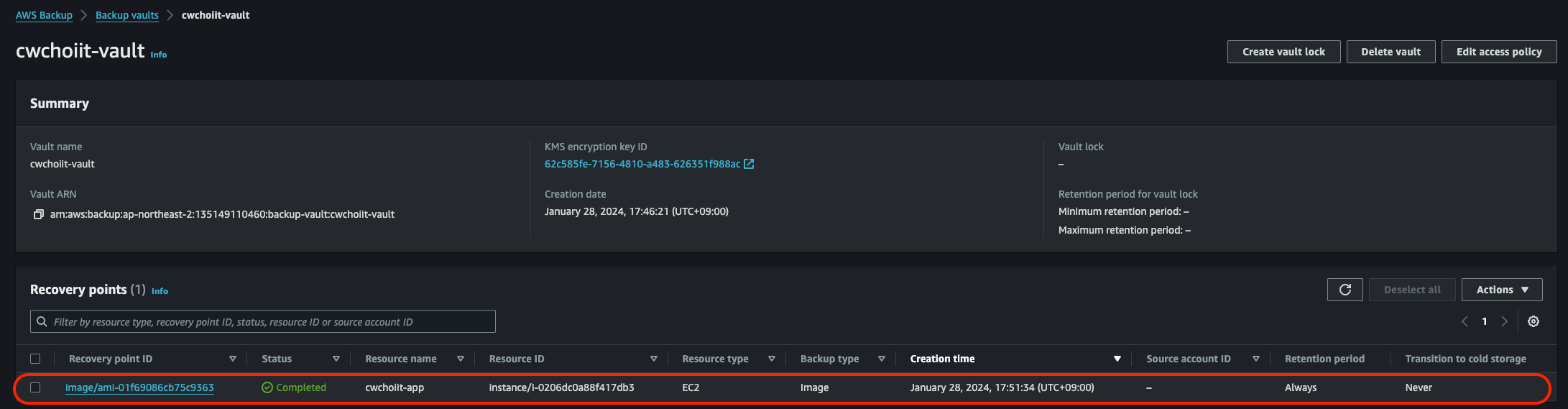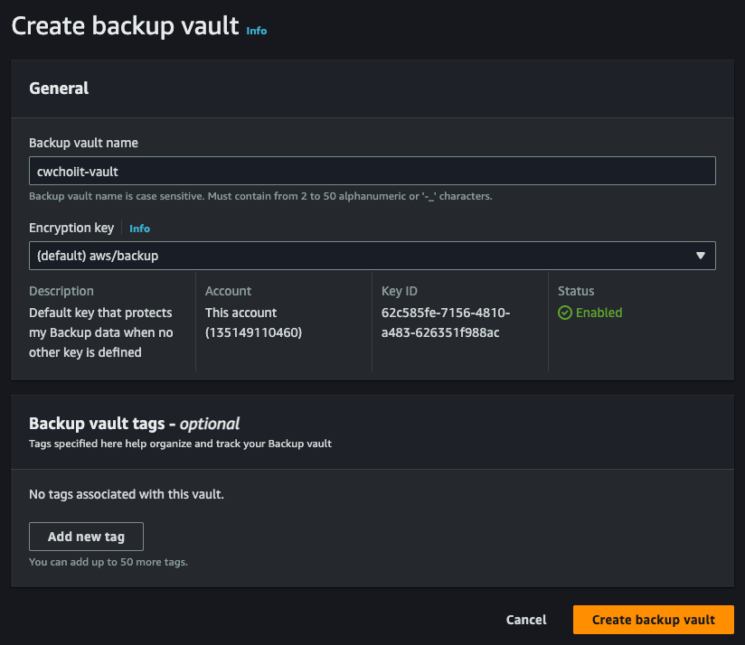 - Backup vault: 위에서 사용했던 vault