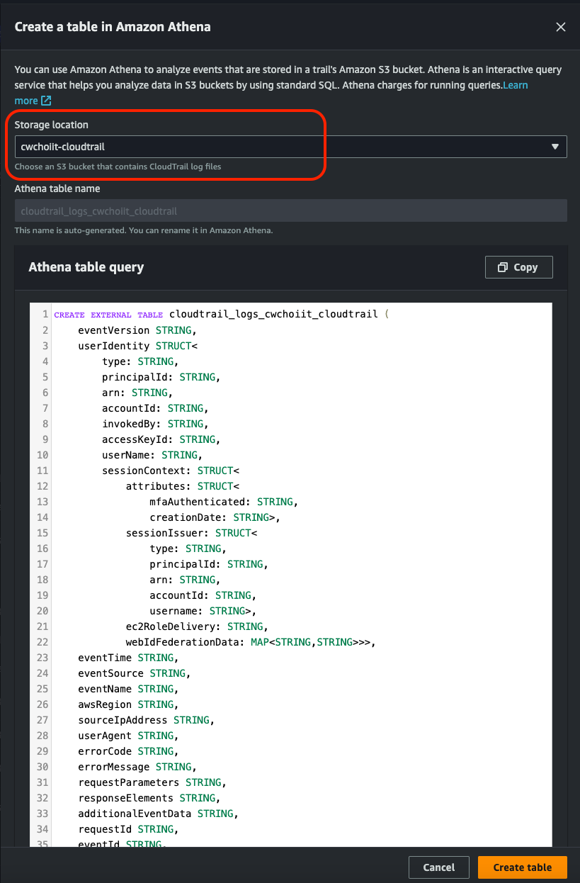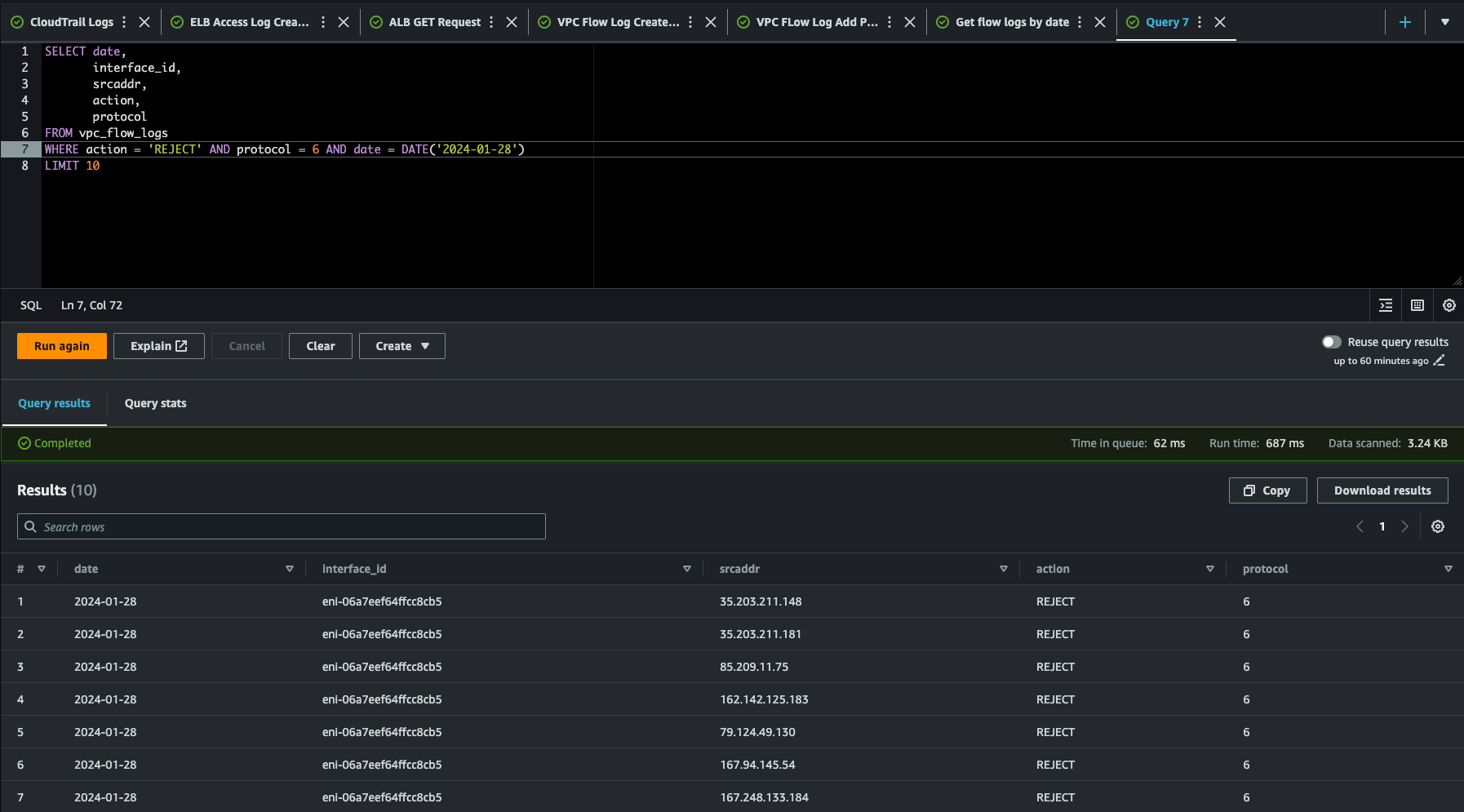 이 로그를 Athena를 통해 쿼리로 데이터를 추출해보자. Athena를 통해 쿼리를 날리려면 VPC 플로우 로그에 대한 테이블이 만들어져야 한다. 테이블 만드는 쿼리는 아래 링크를 참조.