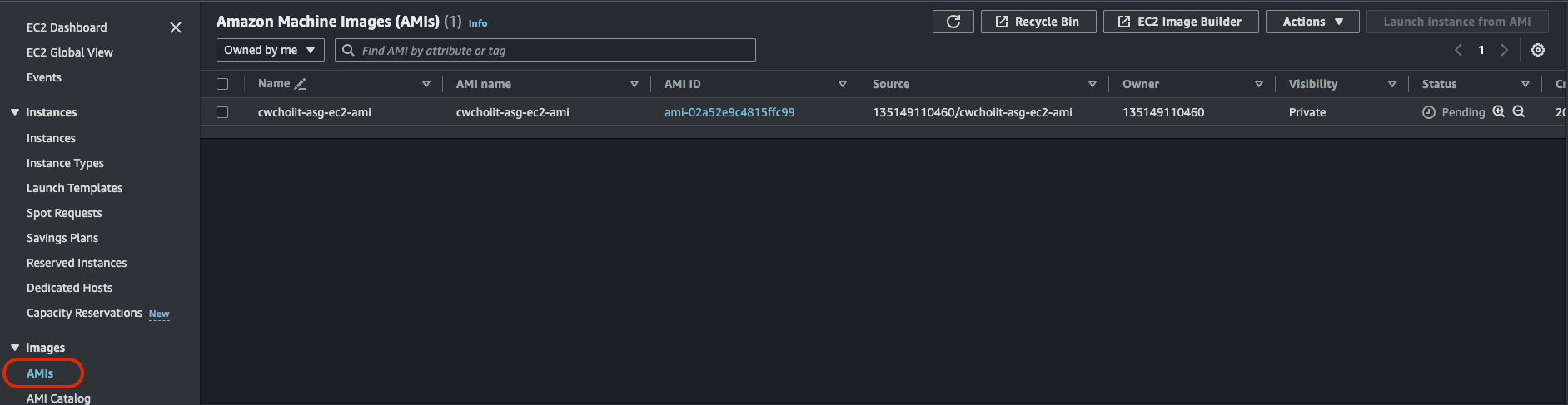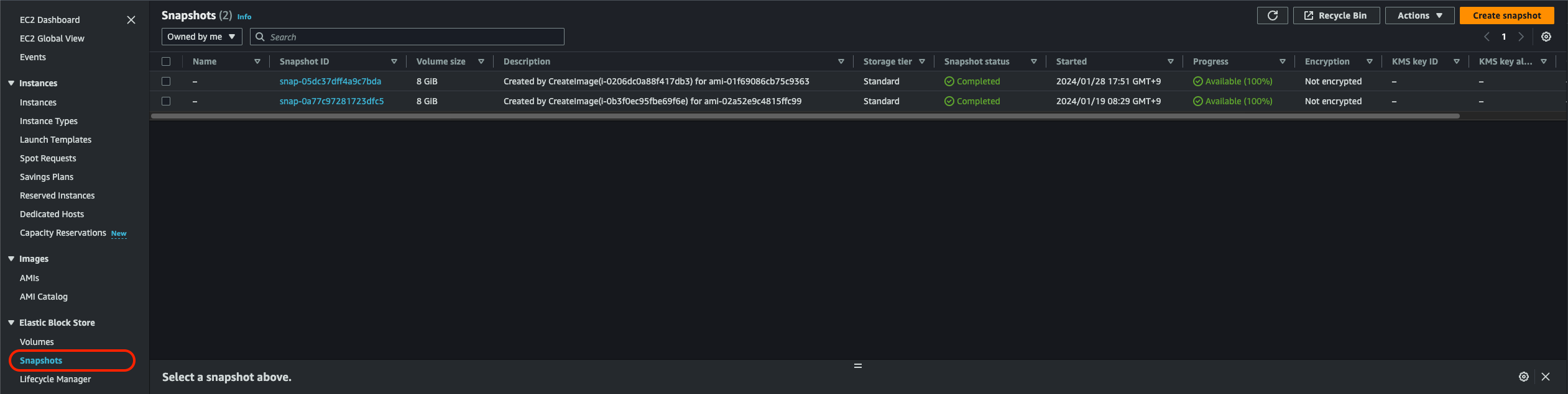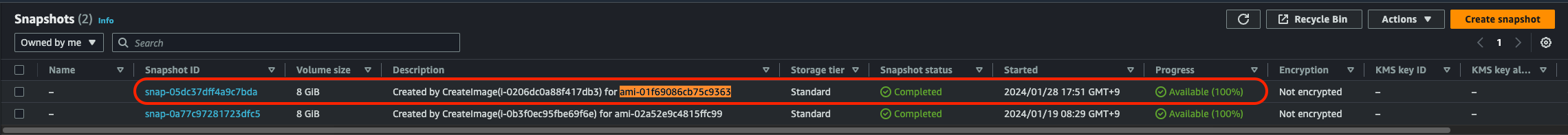 t2.micro는 암호화가 지원이 안된다고 하니 살짝 더 큰 클래스를 선택해보자. (본인은 t2.small을 선택) 이 부분도 시간이 꽤 소요되니까 잘 기다려보자. 다 끝나면 다음과 같이 상태가 Completed로 변경된다.