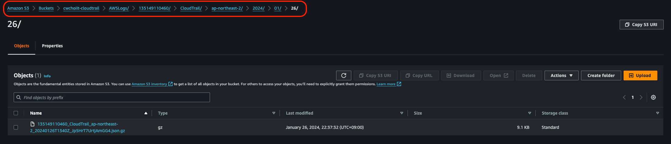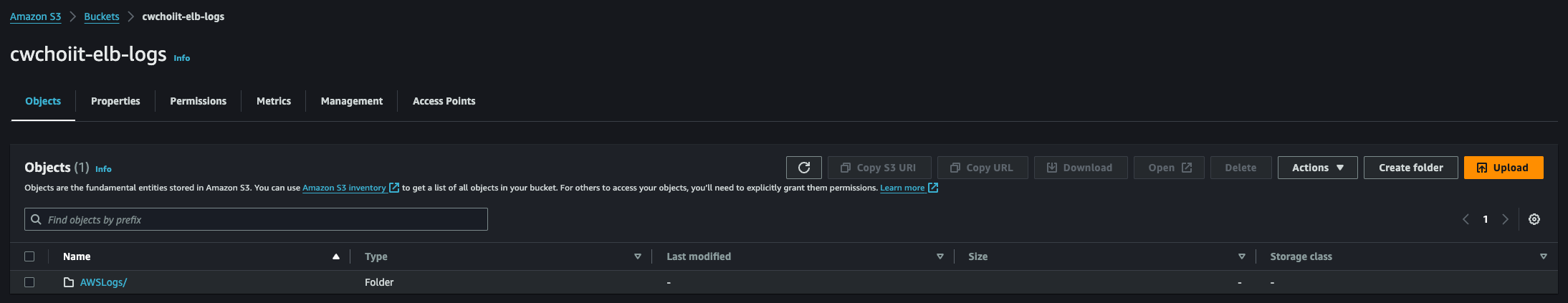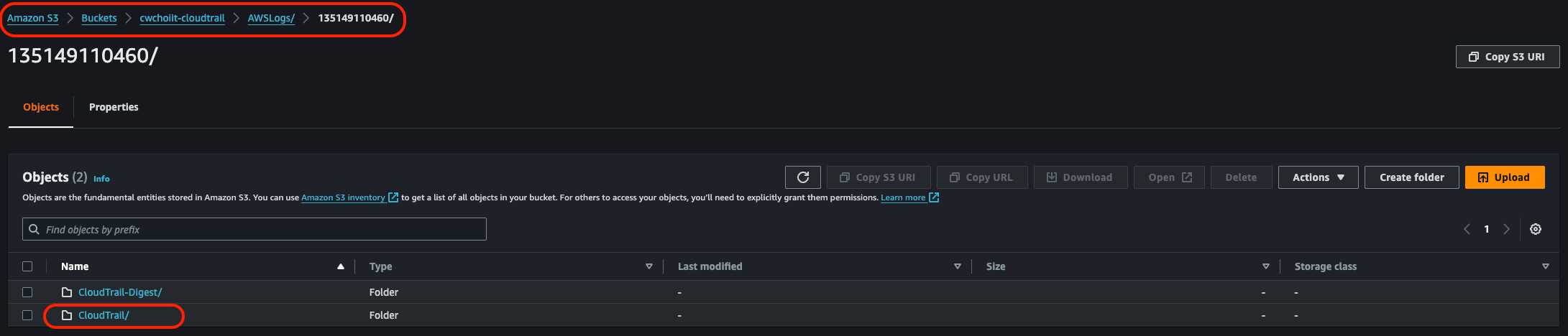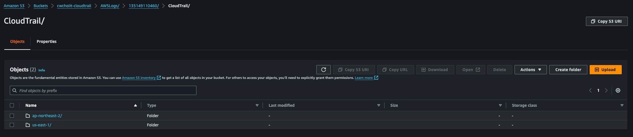 이렇게 생성한 후 S3 버킷으로 가보면 폴더가 자동으로 아래처럼 만들어진다. (AWSLogs/AWSAccountID 경로)