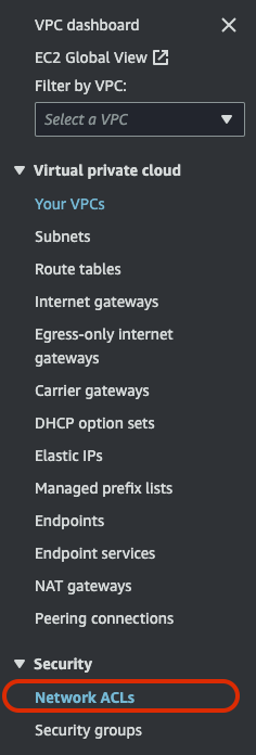 NACL을 직접 설정해서 어떻게 동작하는지 확인해보자. 우선 VPC > Security > Network ACLs로 들어가야 한다.
