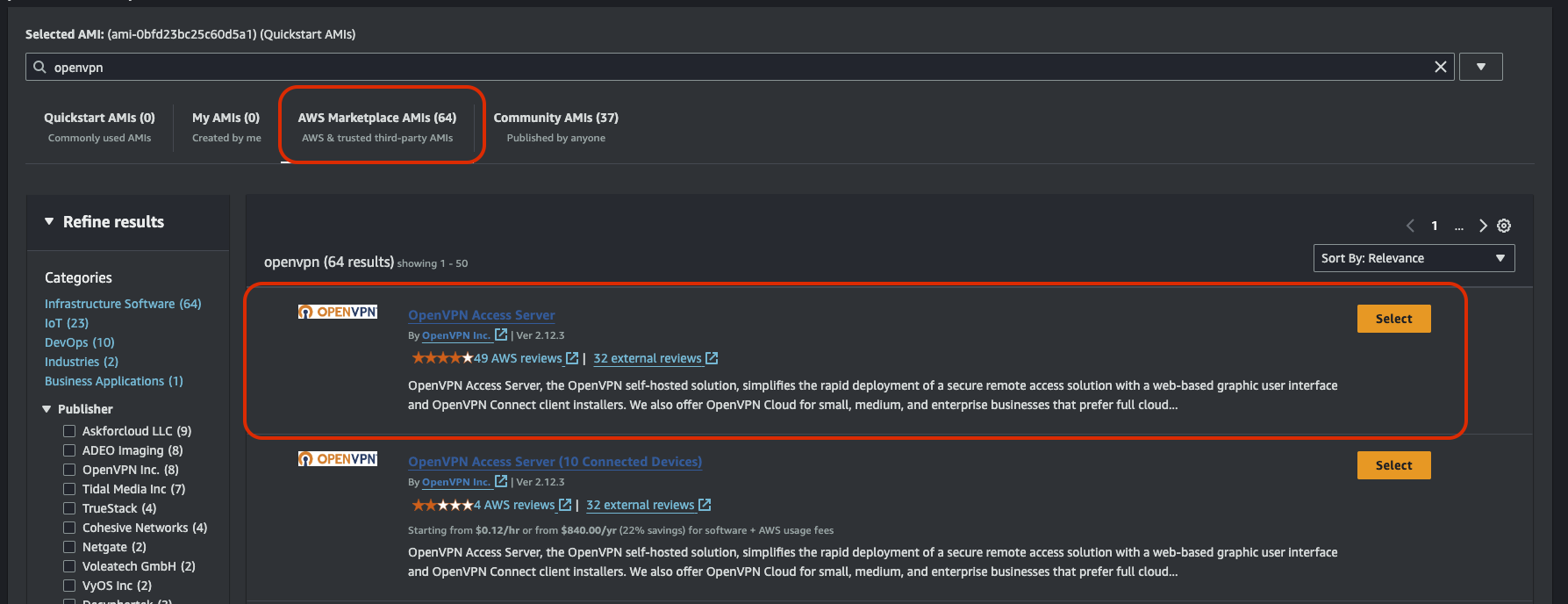 보이는 화면에서 AWS Marketplace AMIs에 가장 상위에 있는 OpenVPN Access Server 이미지를 선택한다.