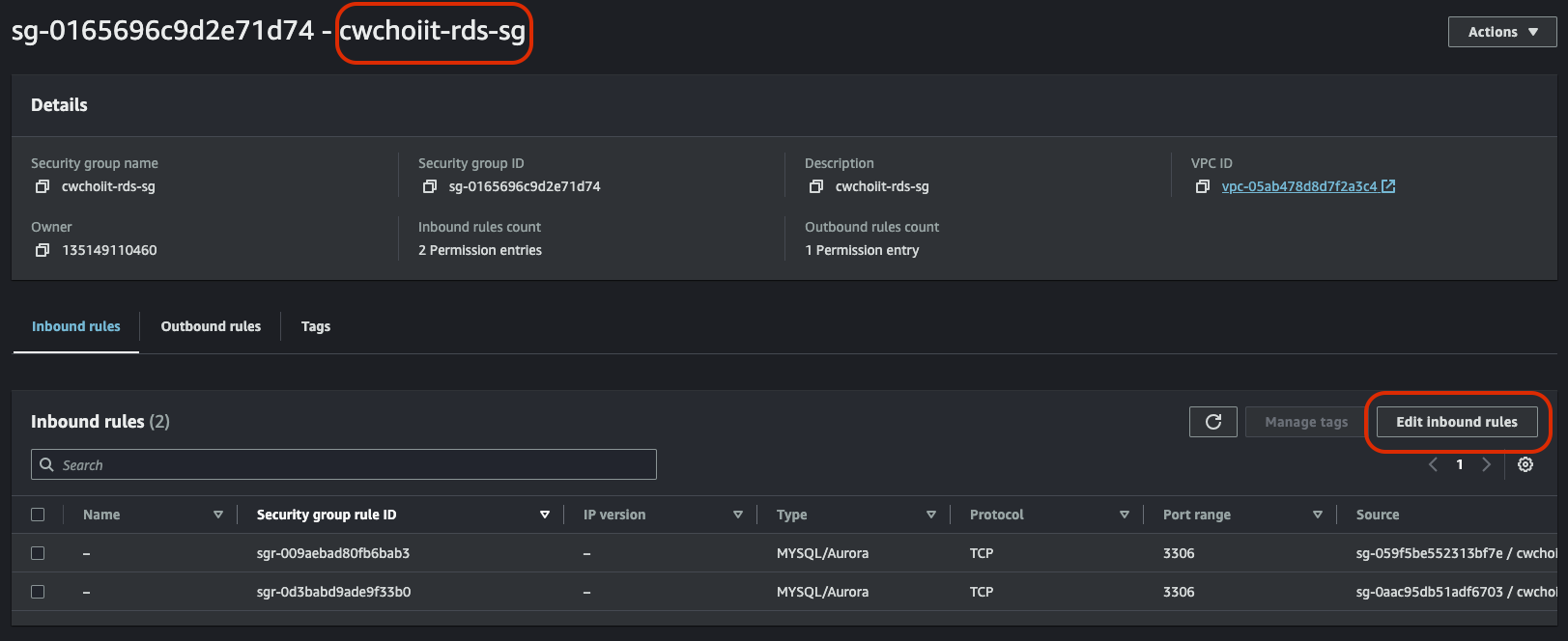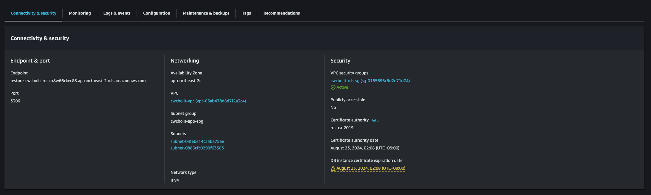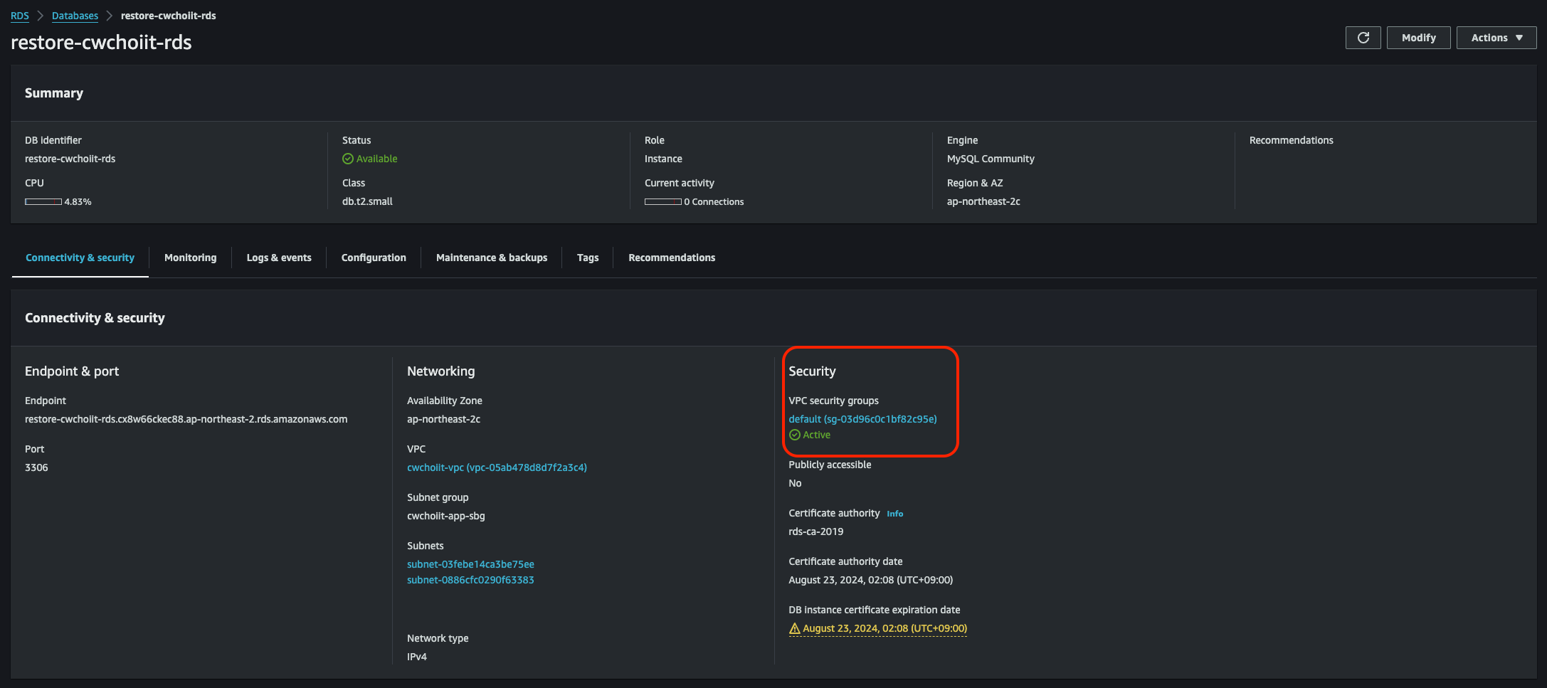 백업한 RDS 세부 정보를 보면 Security group이 default로 설정되어 있다. 이것을 바꿔보자. 기존 RDS가 사용하는 보안 그룹으로.