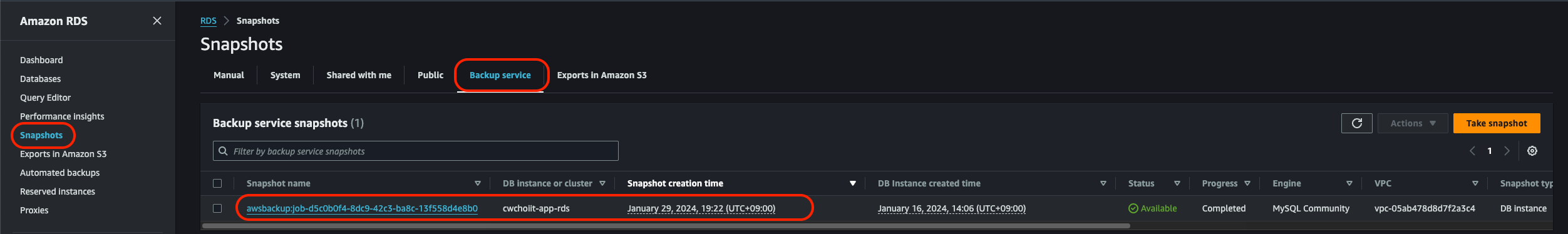 그리고 이 백업된 스냅샷은 RDS 서비스 내 Snapshots 화면에서도 확인할 수 있다. Backup service 탭을 눌러보면 다음과 같이 스냅샷이 보인다.