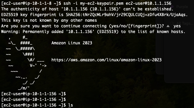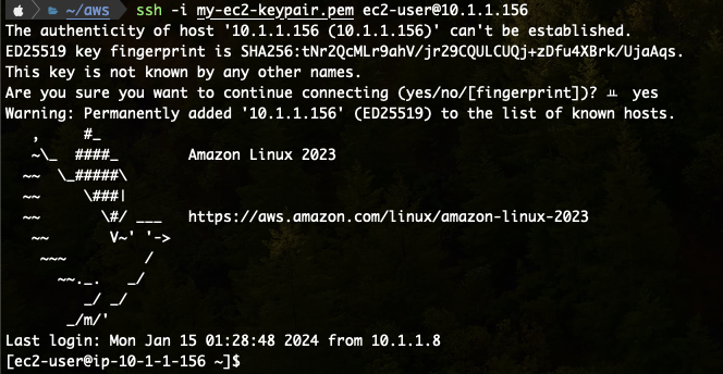 ssh -i my-ec2-keypair.pem ec2-user@10.1.1.156