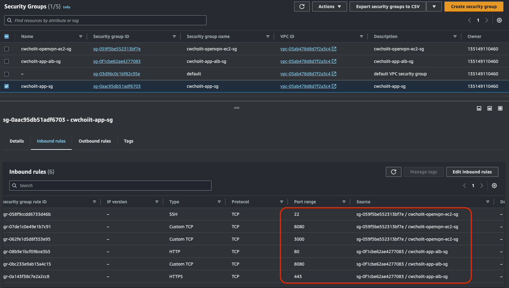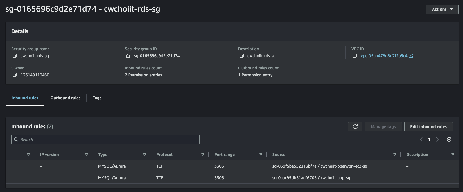 Security Groups > my-private-ec2-sg에서 인바운드 규칙에 다음처럼 OpenVPN EC2를 생성했을 때 만든 보안 그룹을 추가한다.