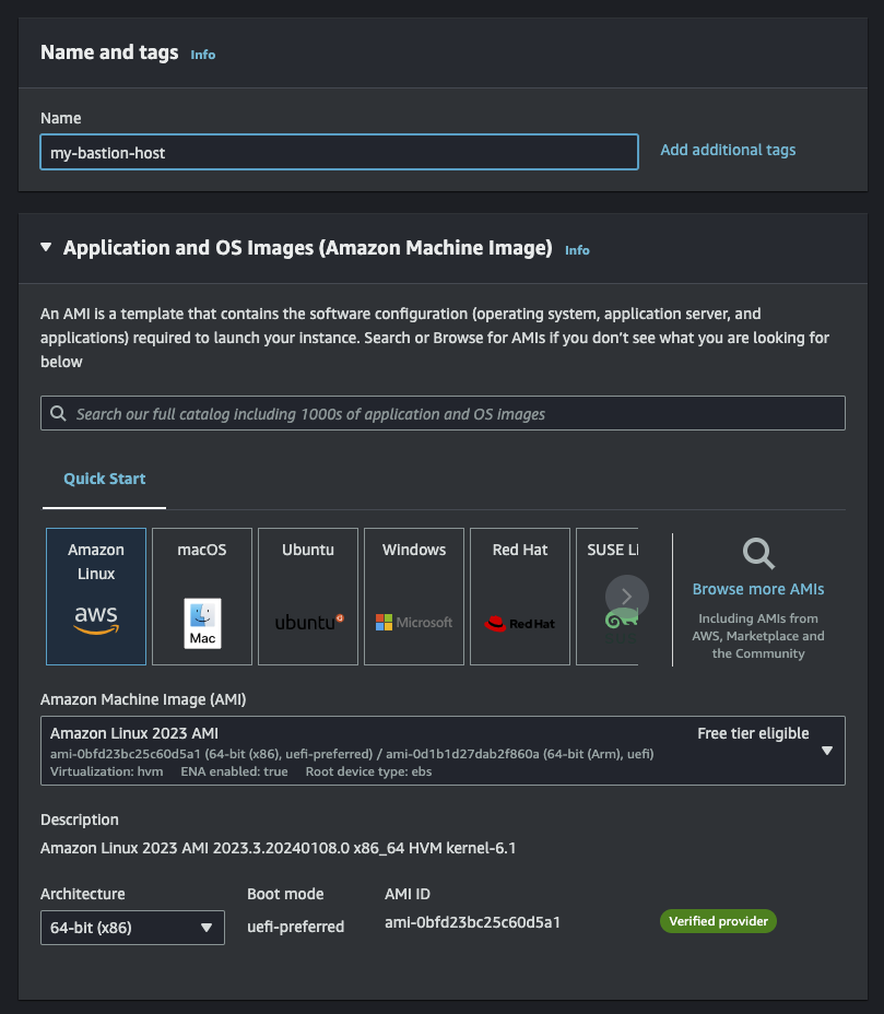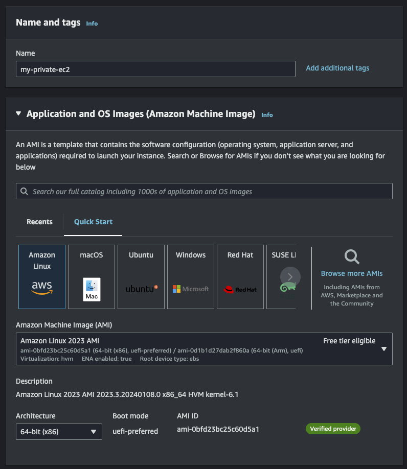 이제 EC2 인스턴스를 생성해보자. Name은 my-tokyo-private-ec2로 설정하고 Amazon Linux 이미지를 사용한다.