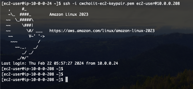 위 그림에서 10.0.0.208이 private EC2이고, 10.0.0.24가 Bastion host이다. 접속해보자.