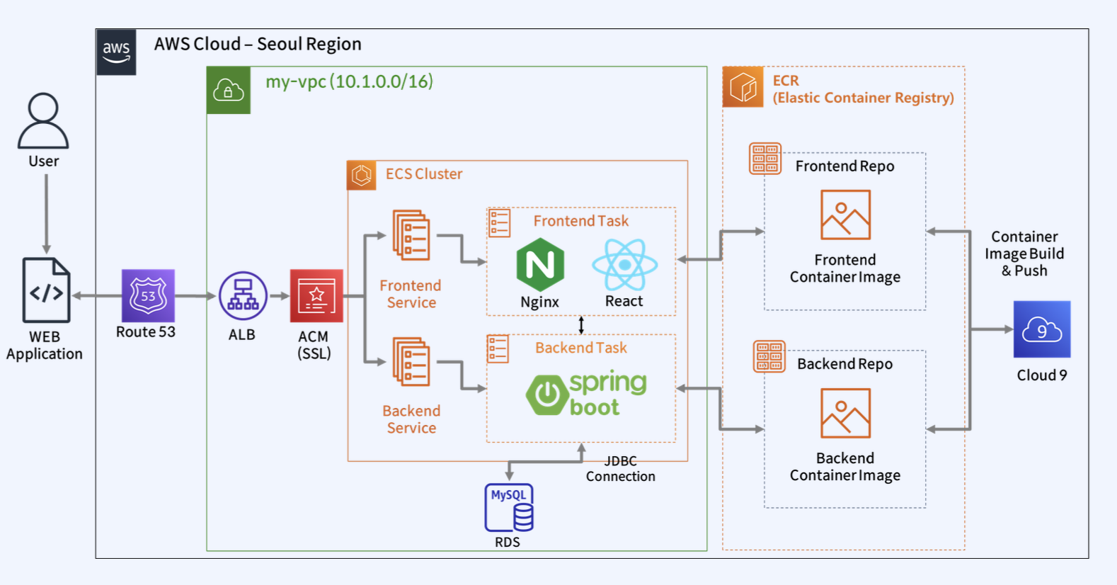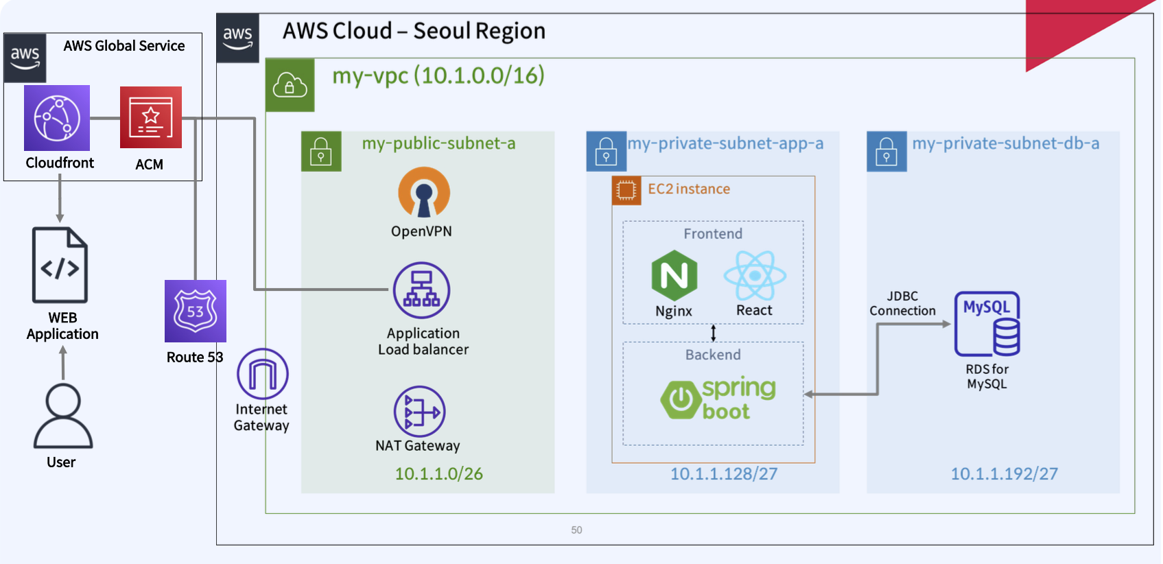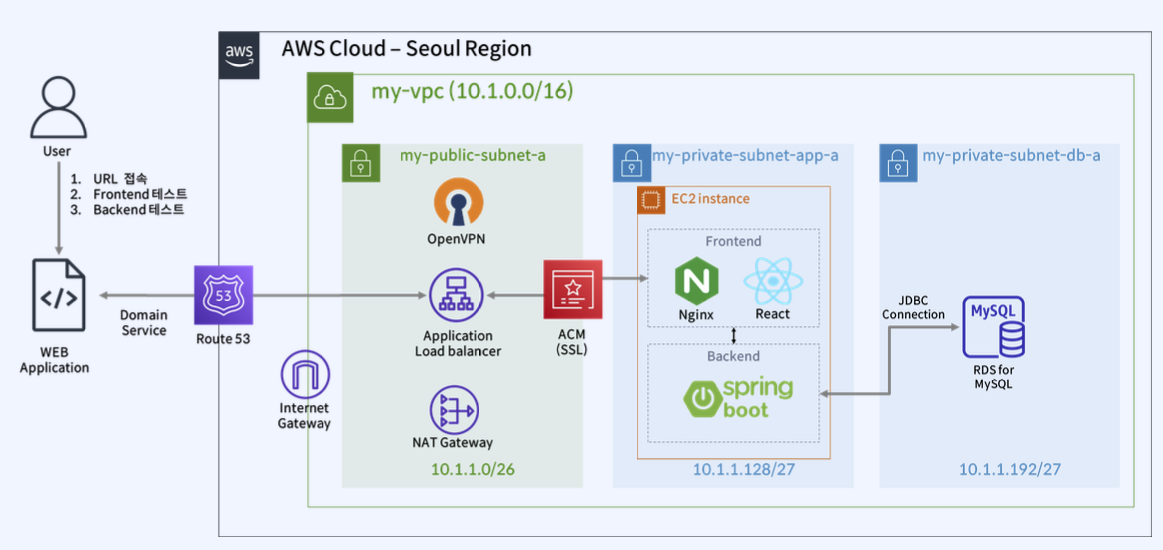 VPC를 최초 생성해 보는것에 시작해서 AZ별 서브넷을 구축하고 퍼블릭 서브넷과 프라이빗 서브넷을 각각의 가용영역에 만들어서 퍼블릭 서브넷은 인터넷 게이트웨이에 프라이빗 서브넷은 NAT 게이트웨이에 연결하여 외부로 통신할 수 있게 하고 그 정의를 라우트 테이블에 해보았다. 더 나아가서 퍼블릭 서브넷에 EC2 인스턴스(Bastion host)를 만들어서 로컬에서 이 곳으로 접근하고 이 곳에서 프라이빗 서브넷에 있는 EC2에 접근하는것을 해보았고 그 과정에서 필요했던 보안 그룹 설정도 만들어보았다. 더 나아가서 Bastion Host에 접근해서 또 다른 EC2에 접근하는 게 아닌 OpenVPN EC2 인스턴스를 만들어서 이 인스턴스가 프라이빗 EC2에 연결할 수 있게 설정하고 로컬에서 OpenVPN을 이용해서 다이렉트로 프라이빗 서브넷의 EC2 인스턴스에 접속할 수 있게도 해보았다. 더 나아가서 서로 다른 Region에 VPC끼리 Peering을 해서 서울에서 도쿄로 통신하는 것까지.