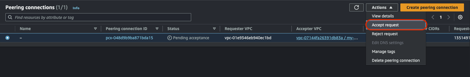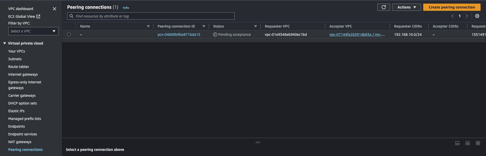 이제 도쿄 VPC에 피어링을 걸어보자. VPC > Virtual private cloud > Peering connections에서 우측 상단 'Create peering connection'을 클릭