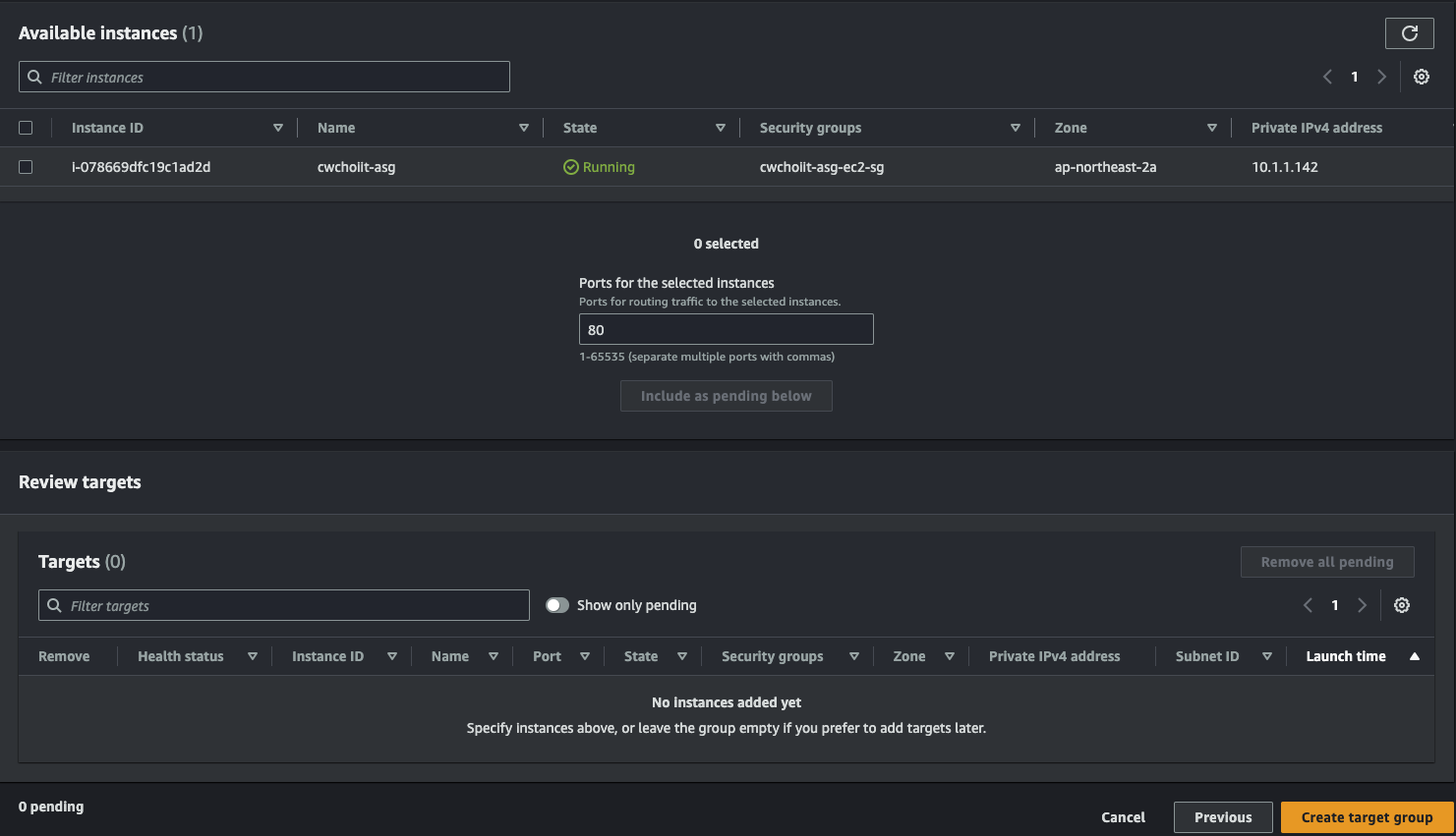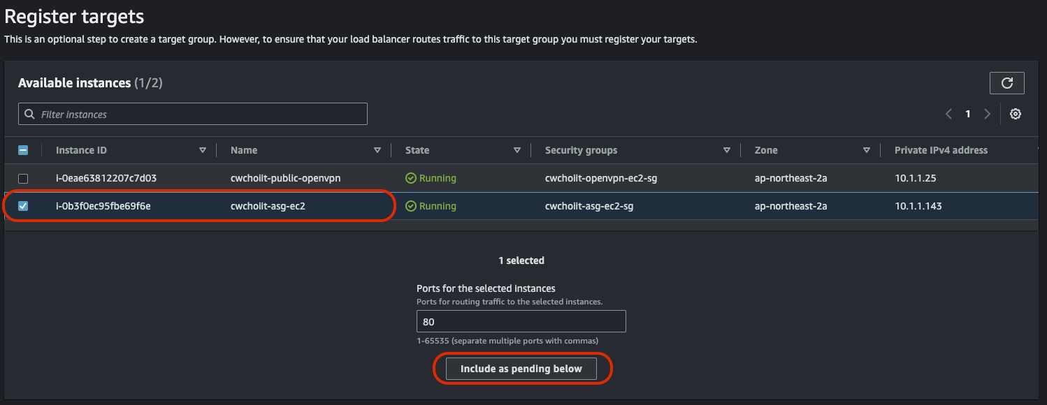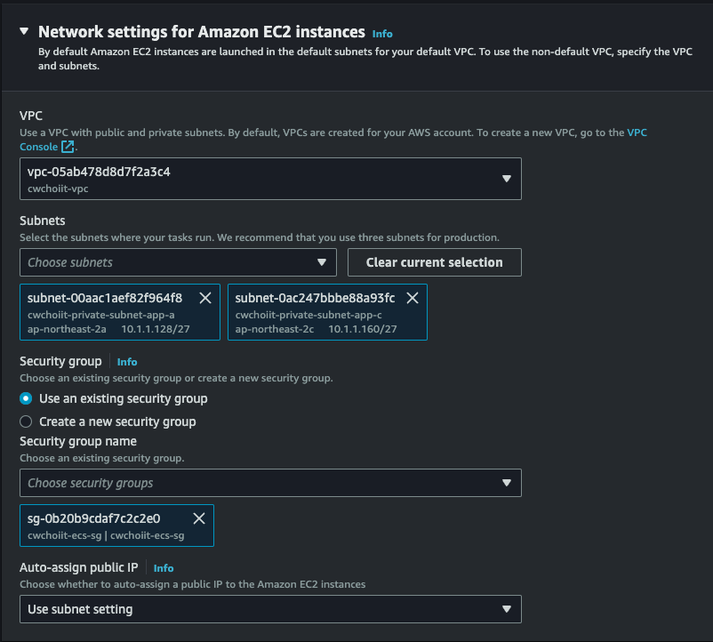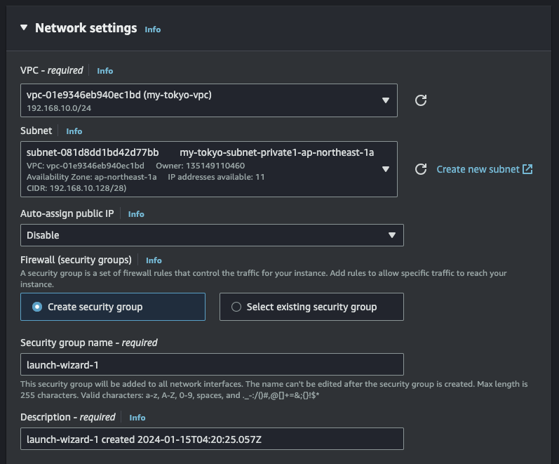 네트워크는 방금 만든 도쿄의 VPC와 private subnet-1을 선택하면 된다.