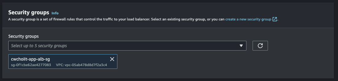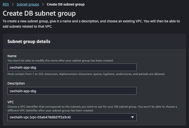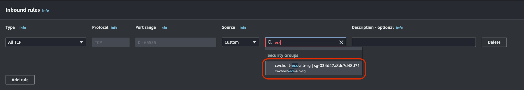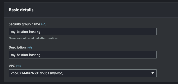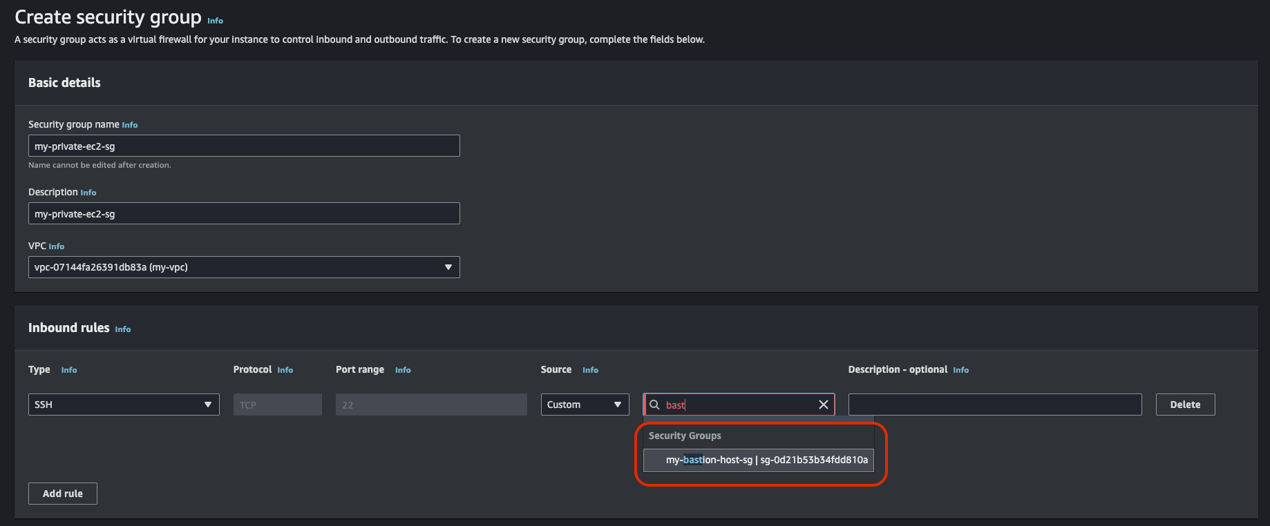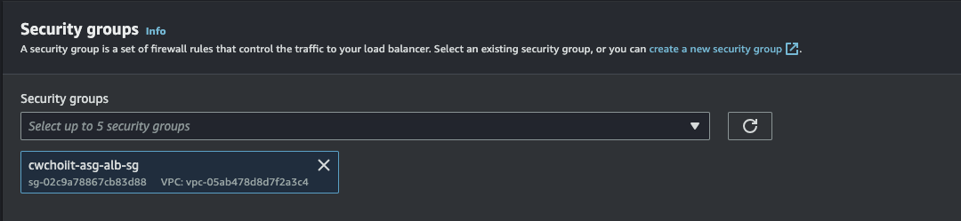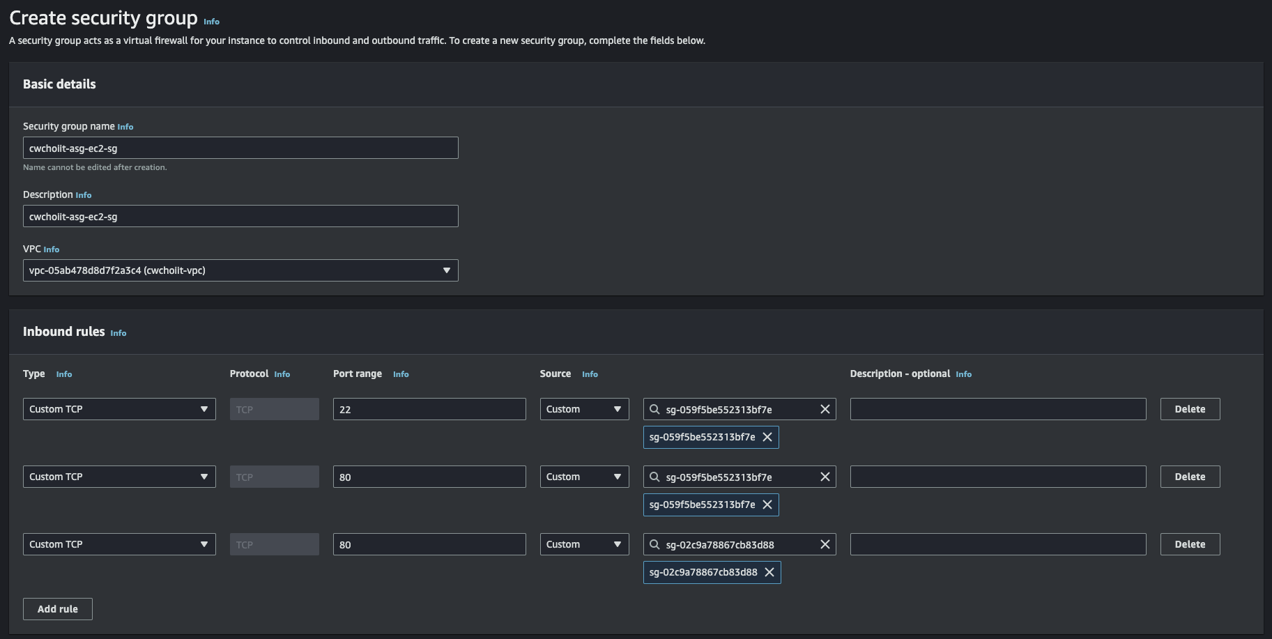 생성하는 화면에서 Security group name, Description, VPC에 값을 지정한다. VPC는 위에서 만든 VPC를 선택한다.