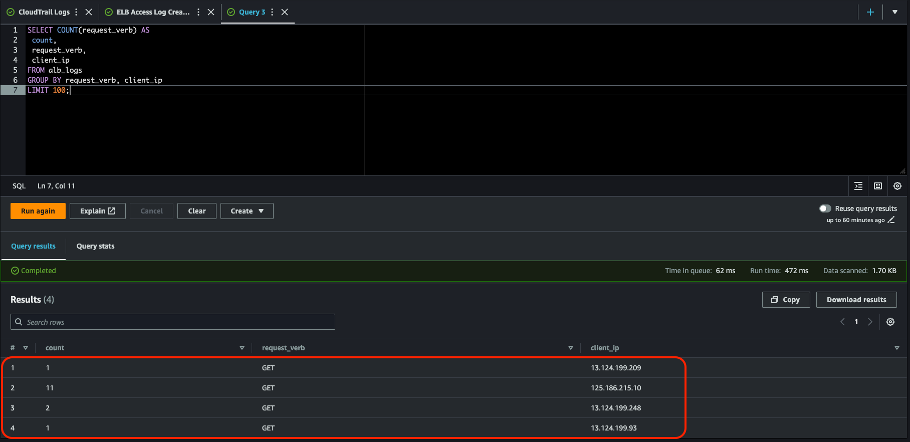 이 쿼리는 클라이언트 IP 주소별로 그룹화된 로드 밸런서가 수신한 HTTP GET 요청의 개수를 계산한다. 날려보자.