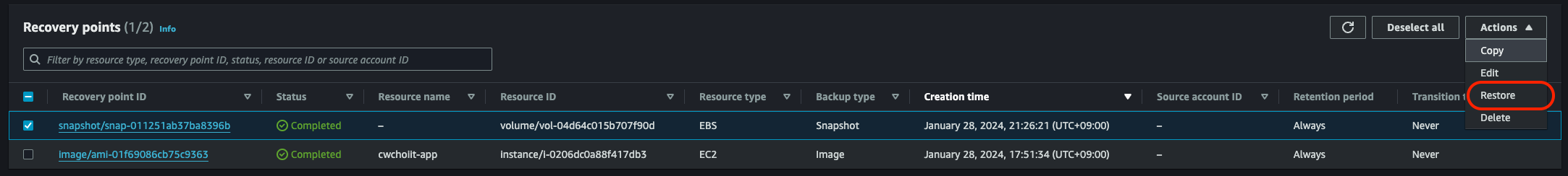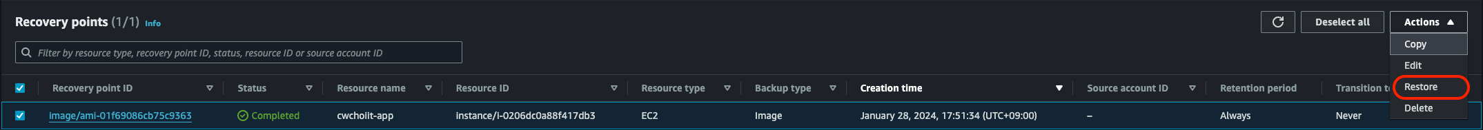 이제 백업한 RDS로 복원을 해보자. 백업 볼트로 가서 백업한 RDS를 선택해서 Actions > Restore