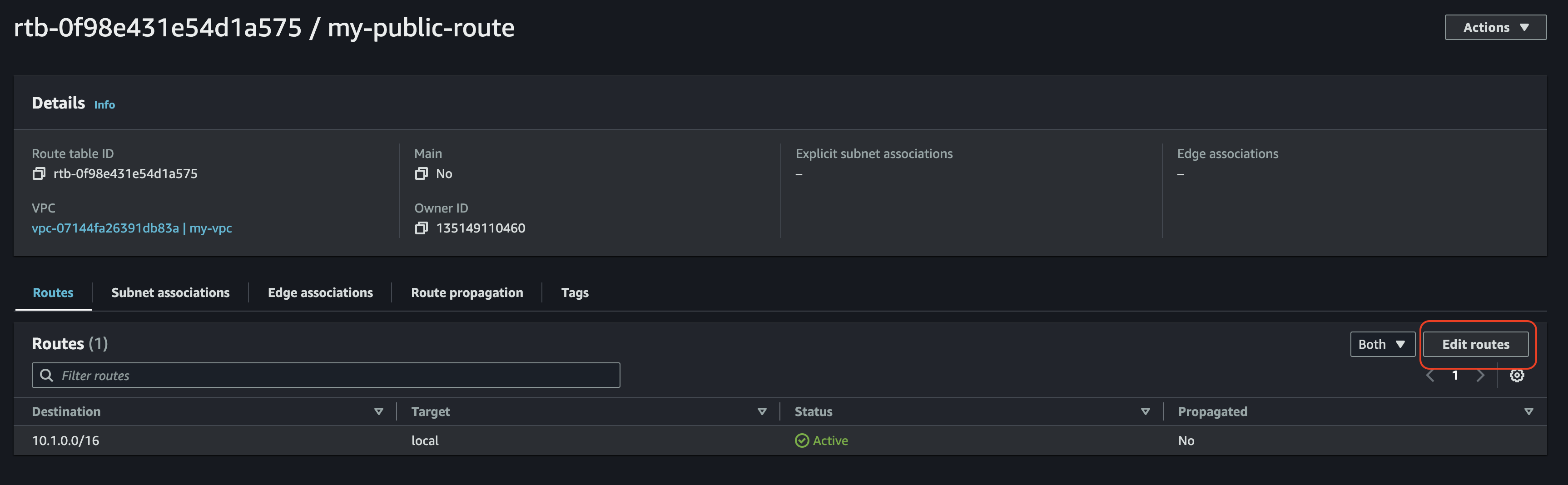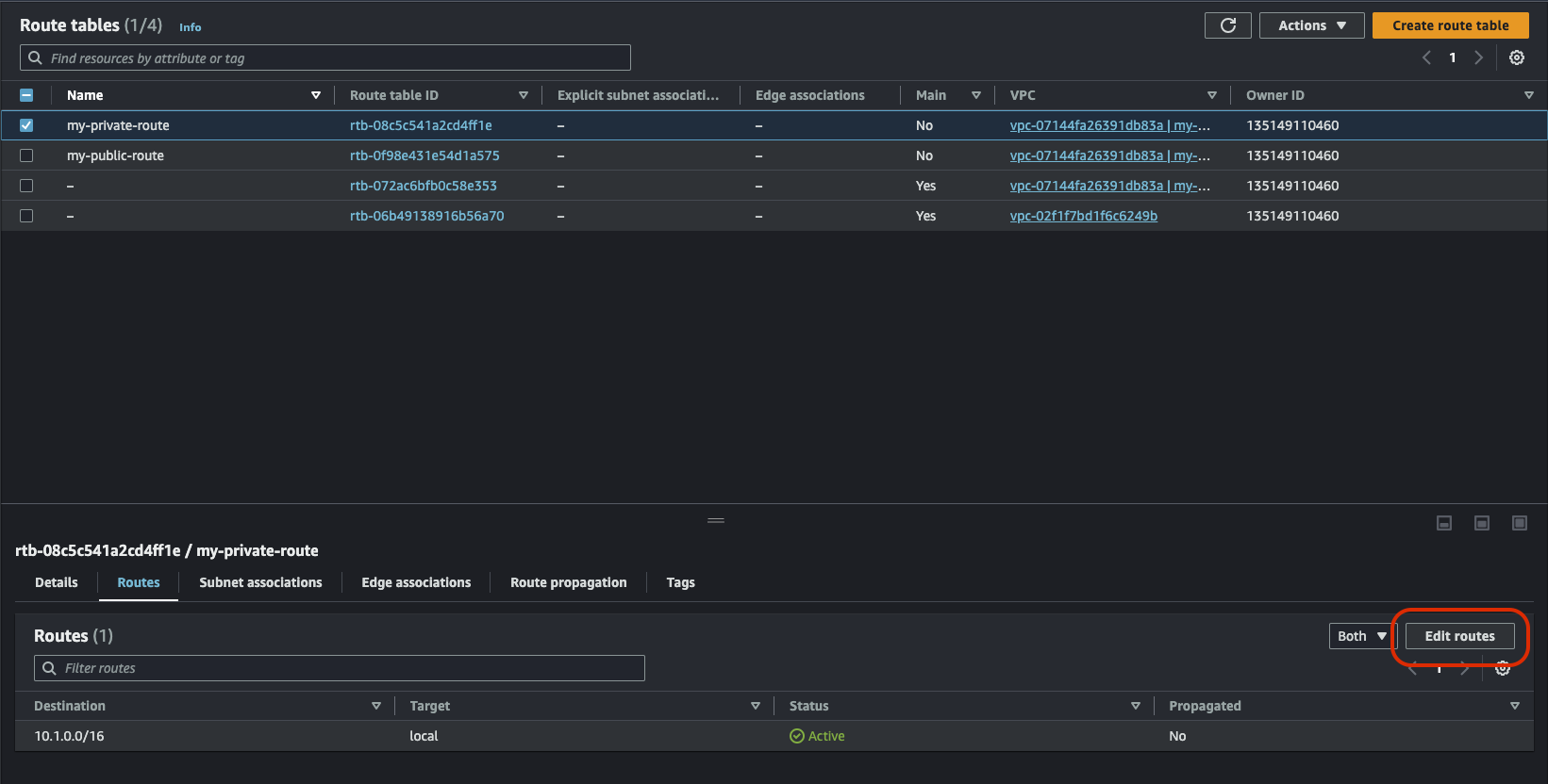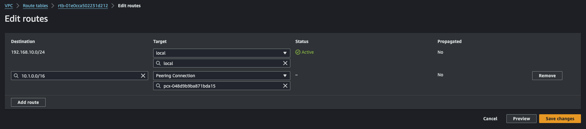 이제 거의 끝났다. 이제 확인만 해보면 되는데 SSH로 서울의 EC2 인스턴스 내부로 들어가자. 그러나 그 전에, 서울의 라우트 테이블에서 프라이빗 용 라우트 테이블에 도쿄 IP를 추가해줘야한다. 반대로도 마찬가지.