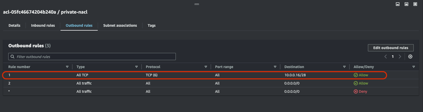 중요한건 이제 밖으로 나가는 Outbound인데 여기서 나가는 포트는 22가 아니다. 왜냐하면 들어오는 포트가 22인거지 나를 호출한 곳은 22가 아니란 얘기다. Outbound에 22로 설정하면 이 private EC2에서 어딘가로 SSH를 접속하는것을 의미하게 된다. 난 그것을 원하는게 아니고 나의 22번 포트로 들어온 요청에 대한 응답을 보내고자 한다. 그래서 Outbound는 임시포트(1024 - 65535) 중 아무거나를 허용해야 한다. 다음 그림처럼 말이다.