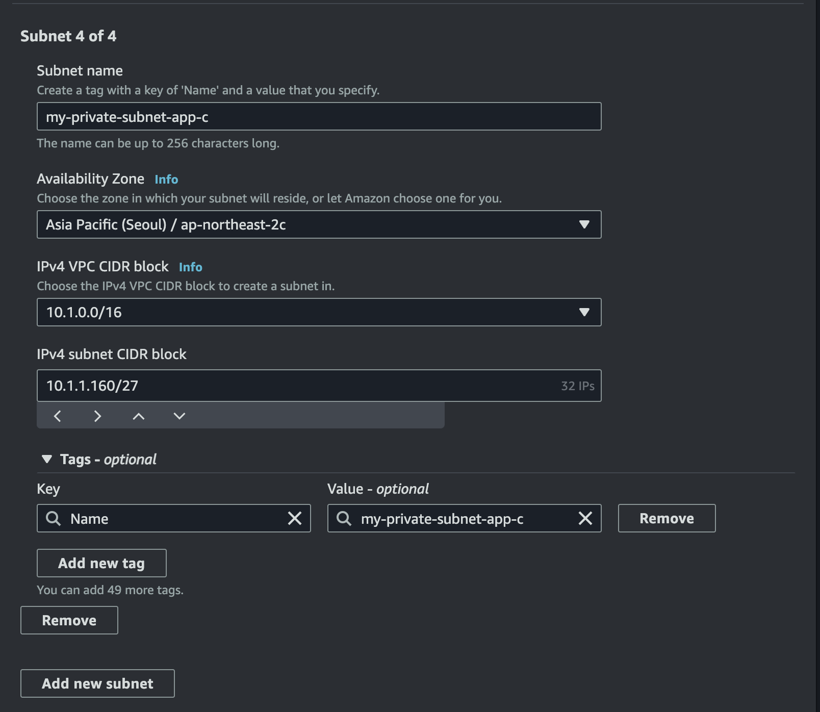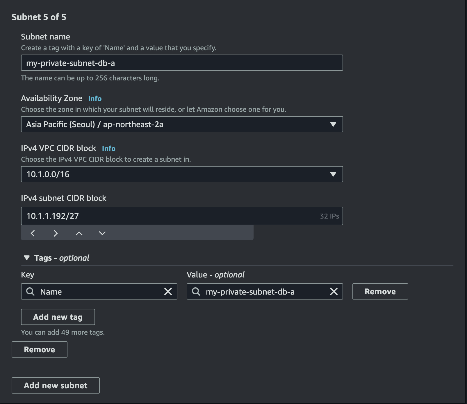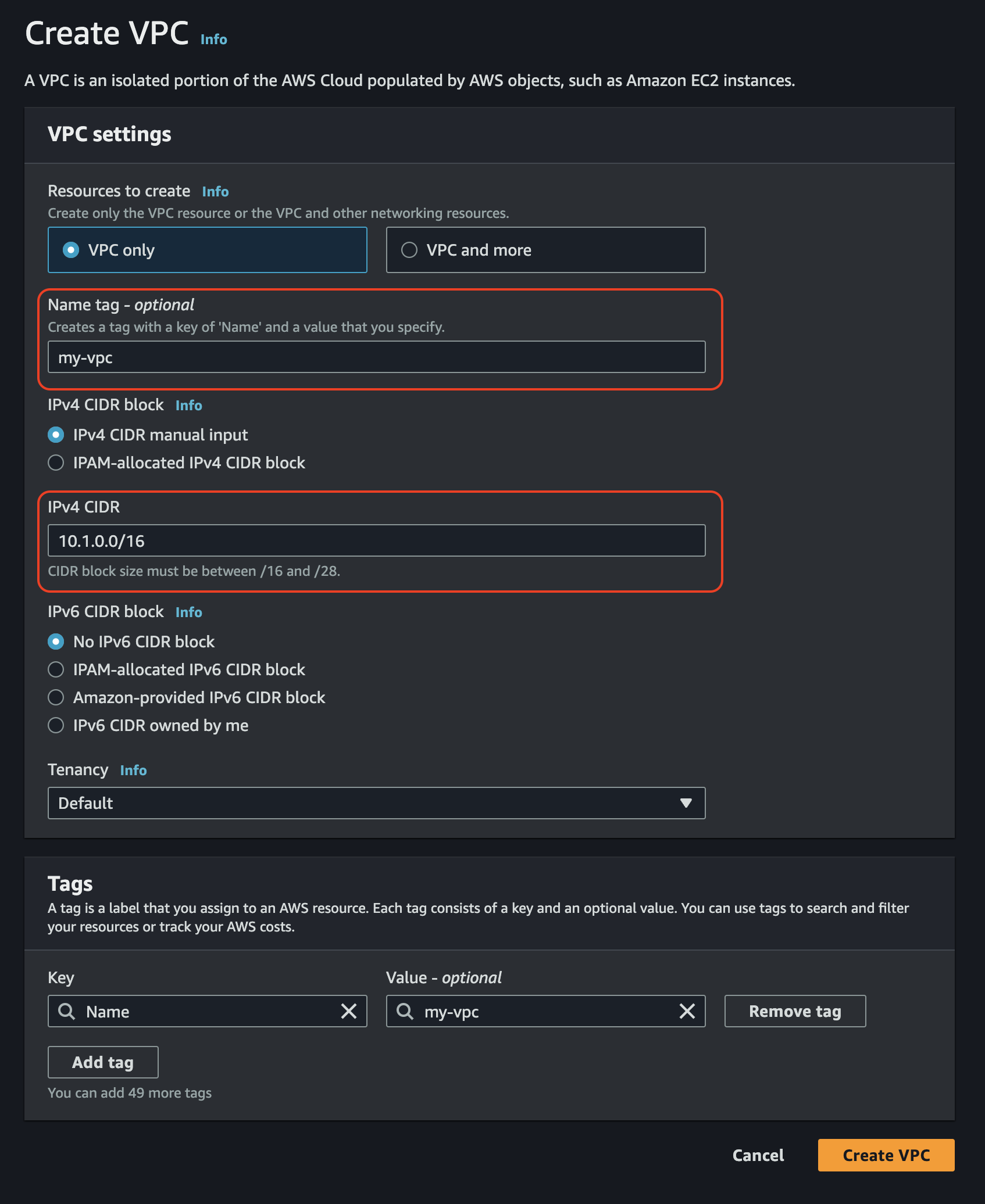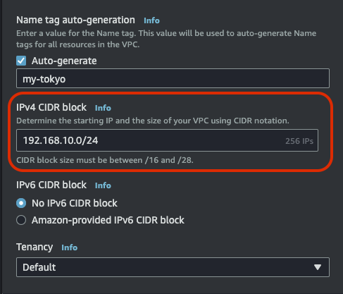 여기서 추가 설정을 해주자. 우선 VPC IPv4 CIDR을 192.168.10.0/24로 설정한다.