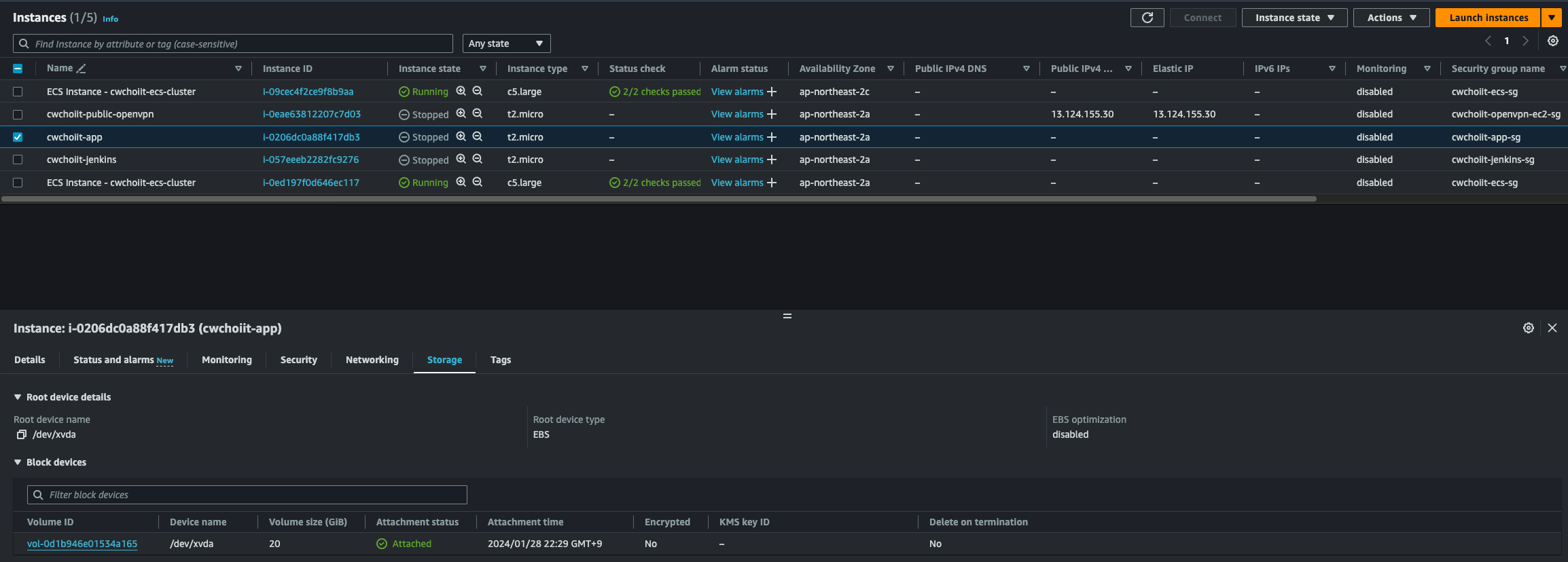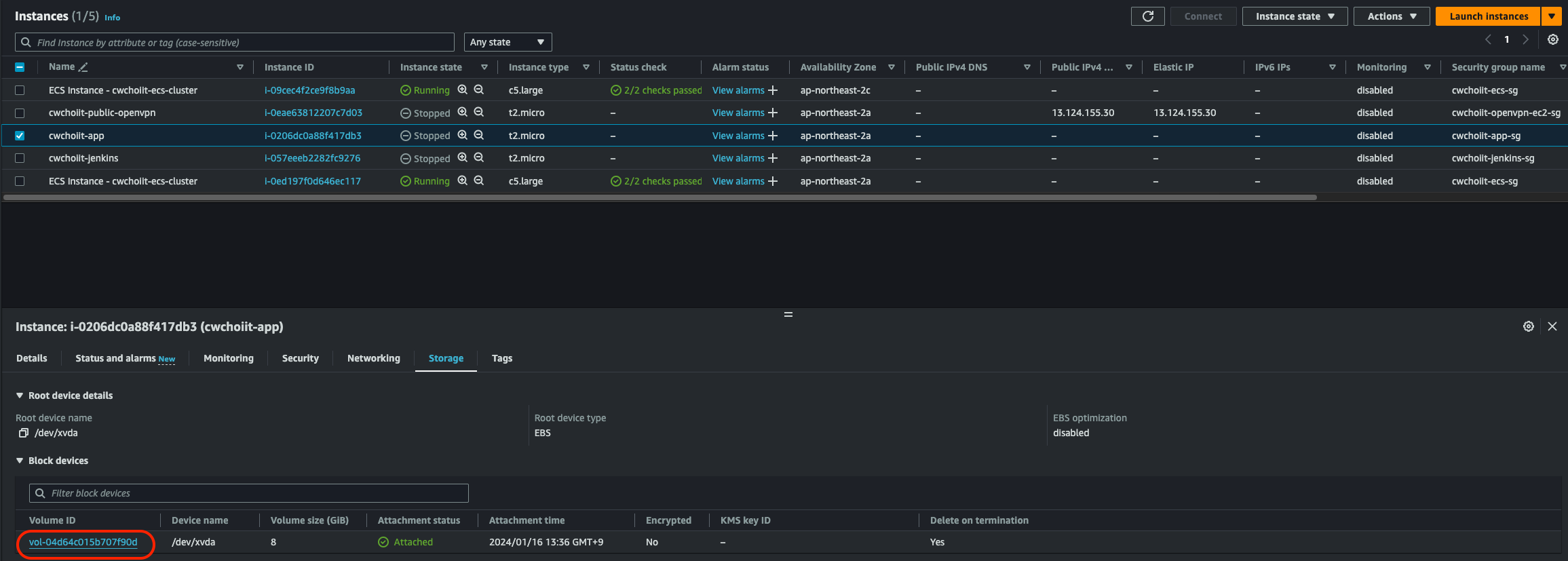 인스턴스에서도 확인 가능하다. 백업한 볼륨을 붙인 인스턴스를 클릭해서 하단 Storage 탭을 클릭하면 볼륨 ID가 보인다. 백업한 볼륨의 ID인지 확인.