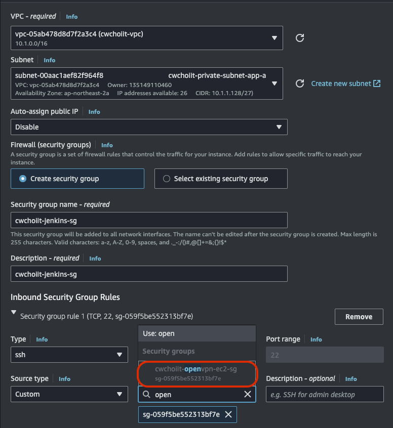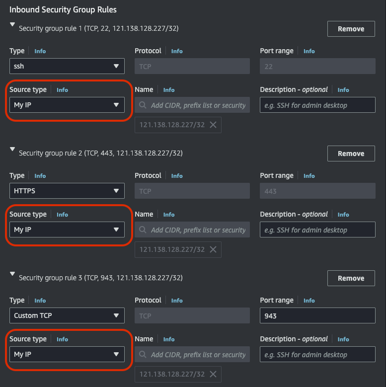 이제 Network settings은 VPC는 위에 만든 VPC, Subnet은 public subnet A, 보안 그룹은 기본으로 설정된 보안 그룹 그대로 가져가되, 아래 규칙은 모두 My IP로만 가능하게 변경하자. 아래 사진 말고 더 있다. 나오는 거 전부 My IP로 선택.