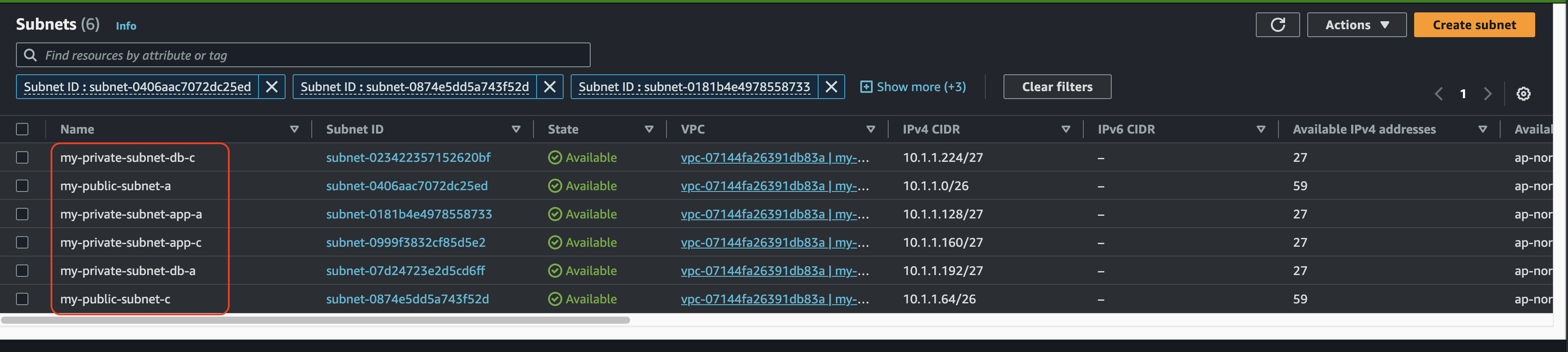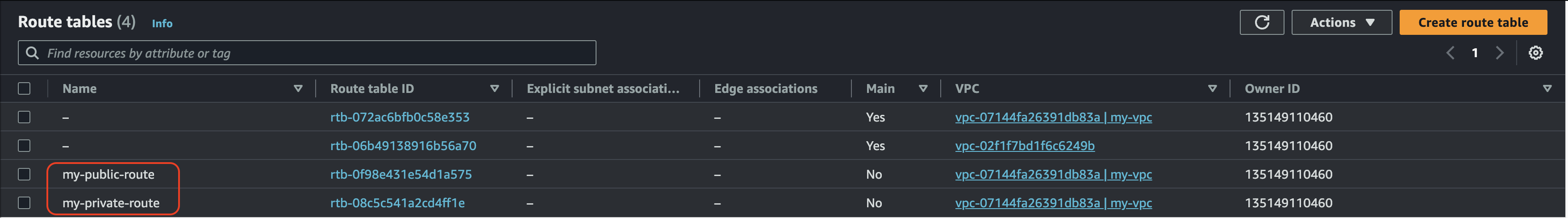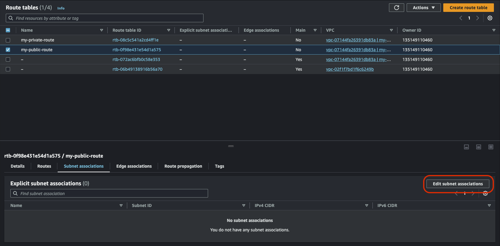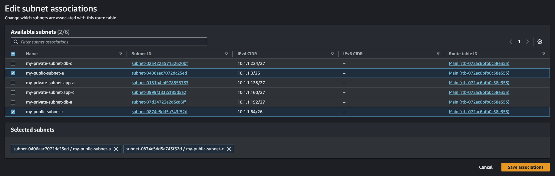 다음은 my-private-route를 선택하고 서브넷을 연결한다. 여기에는 프라이빗 서브넷들은 선택하면 된다.