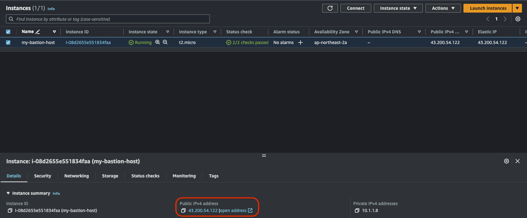 이제 진짜 Bastion host에서 private EC2에 접속해 보자. 우선 Private EC2의 Private IPv4 Address를 확인하자.