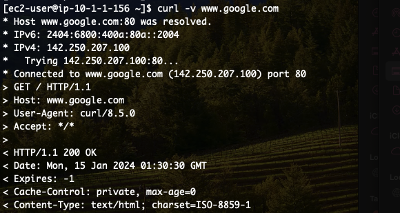 들어와서 한 가지 더 확인할 게 있다. 바로 NAT gateway를 통해 내부에서 외부로 통신이 가능한지를 확인하는 것. 다음 명령어를 통해 외부 인터넷으로 통신이 가능한지 확인해 보자.