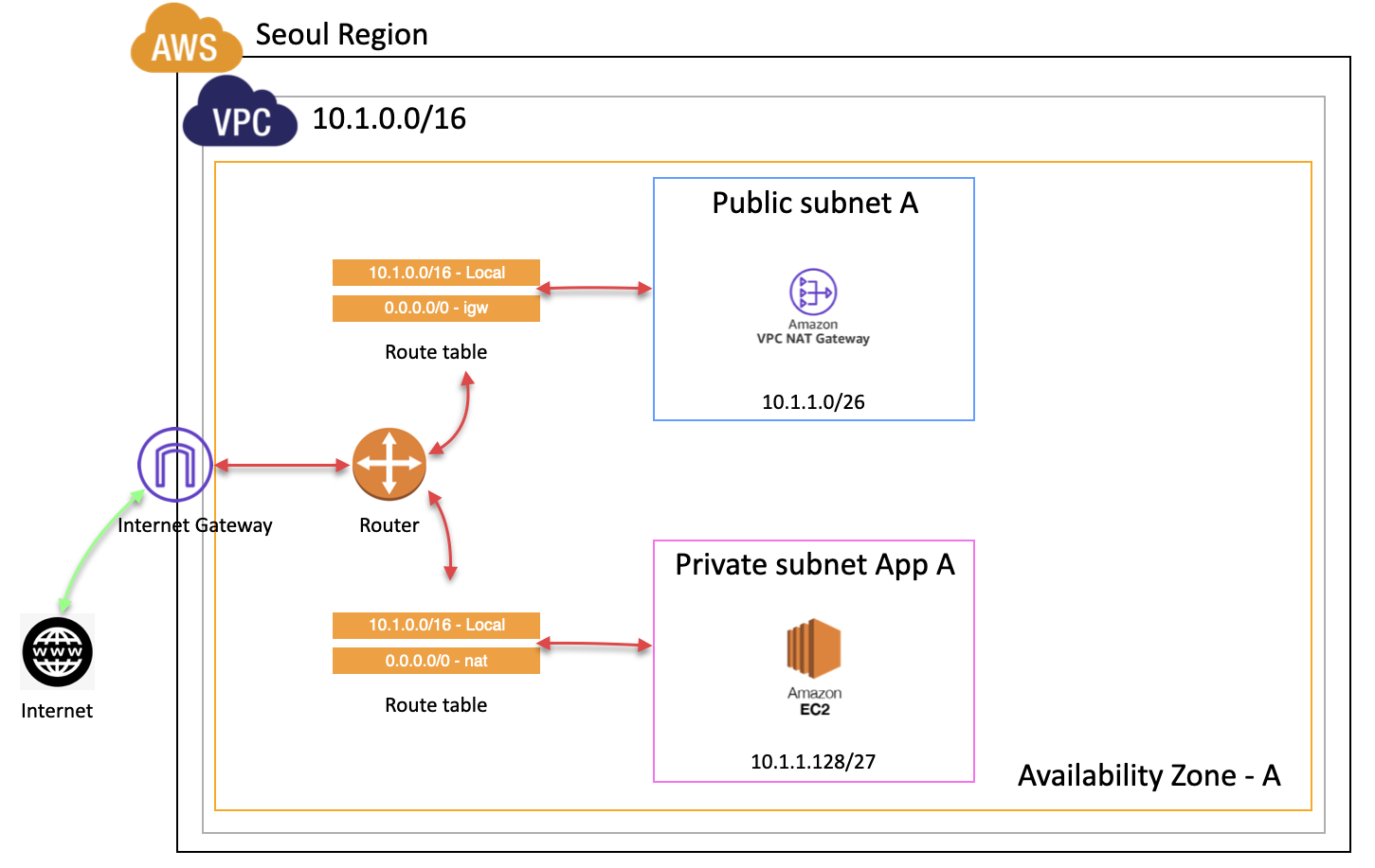 Public subnet에 매핑된 route table은 0.0.0.0/0이 Internet Gateway를 향하고 있고 Private subnet에 매핑된 route table은 0.0.0.0/0이 NAT Gateway를 향하고 있기 때문이다.