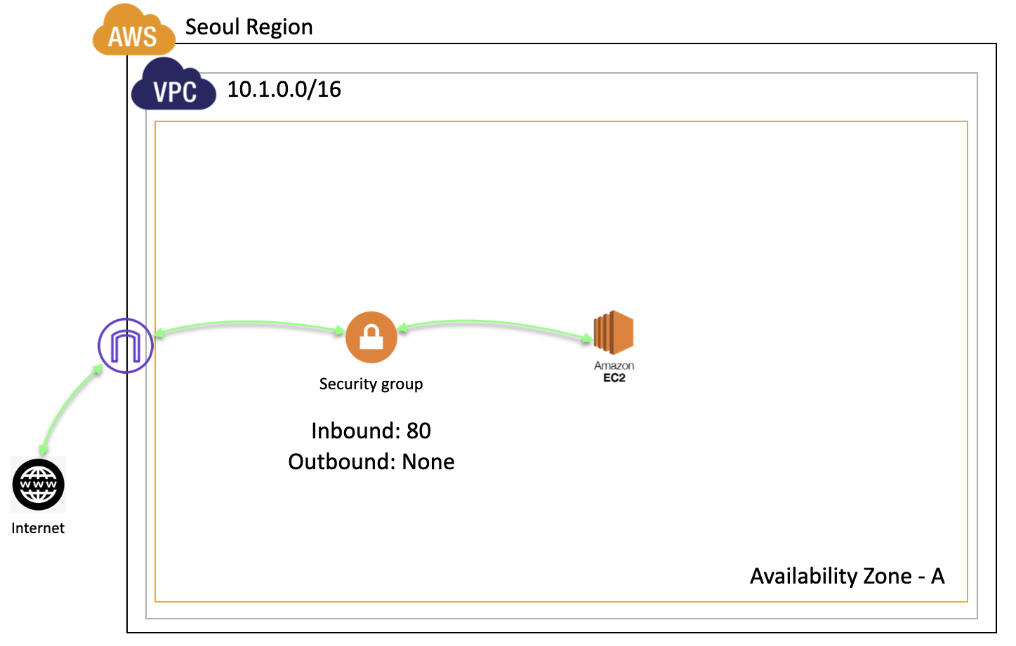 Security group은 Stateful한 보안 체계이다. 즉, 들어오는 요청을 기억하고 있다가 응답한다는 의미이다. 결론부터 말하면 이 Security group에 위 NACL처럼 Inbound에 80, Outbound에 아무것도 허가하지 않더라도 요청을 80으로 했다면 클라이언트는 요청에 대한 응답을 받을 수 있다.