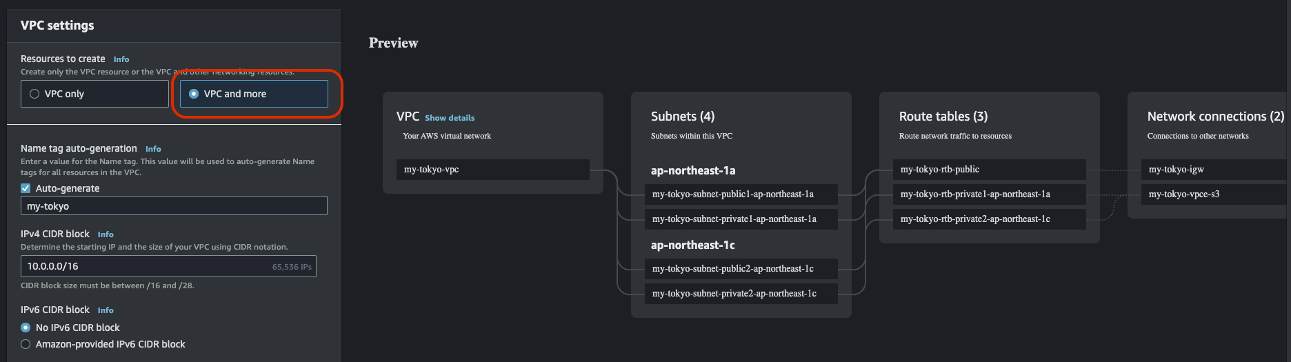생성 화면에서 VPC settings에 'VPC and more'를 선택하면 좀 더 템플릿 느낌으로 VPC와 그 외 Subnet, Network, Route tables등을 만들어준다.