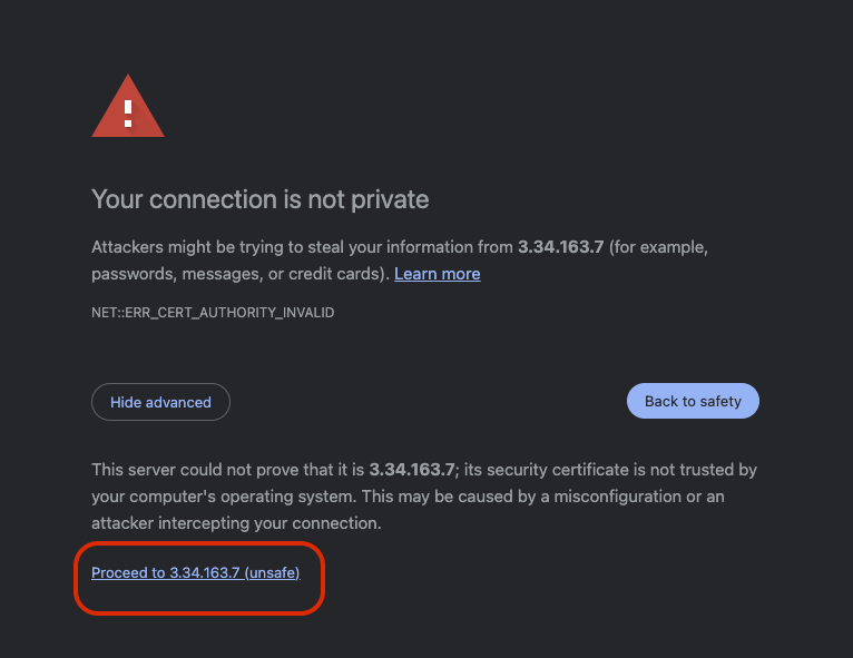 이 경로로 접속해 보자. 접속하면 다음처럼 경고 화면이 나오는데 '안전하지 않음'으로 접속하면 된다.