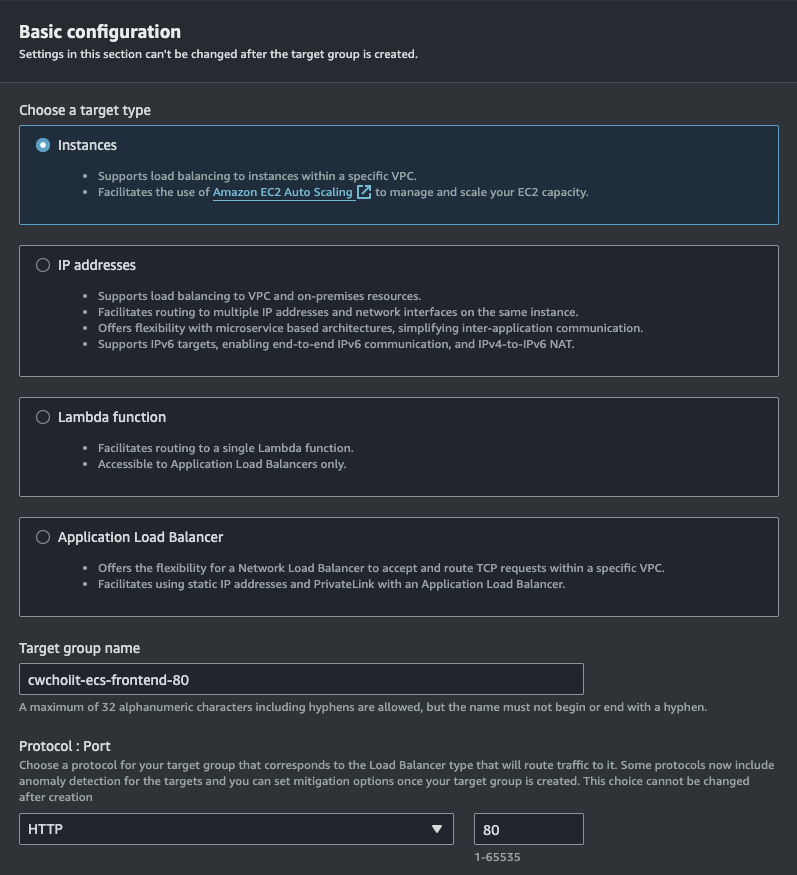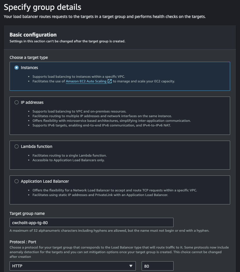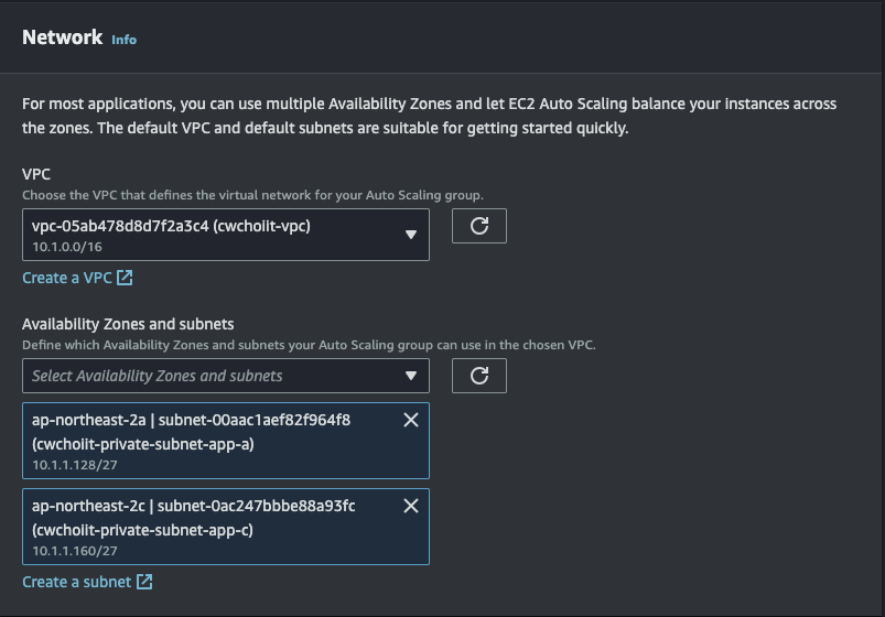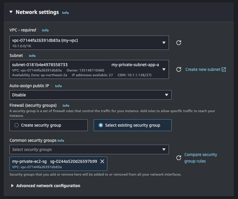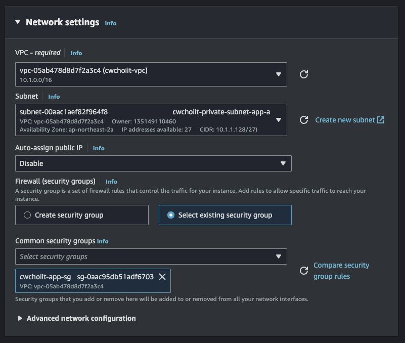 Network settings는 VPC는 위에서 만든 VPC, Subnet은 Private Subnet App a, Security group은 방금 만든 보안 그룹을 선택하고 생성을 완료한다.