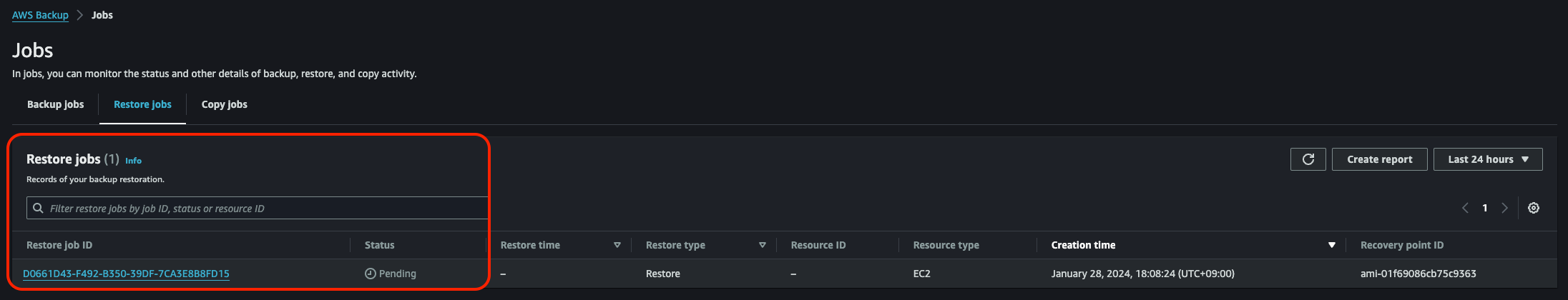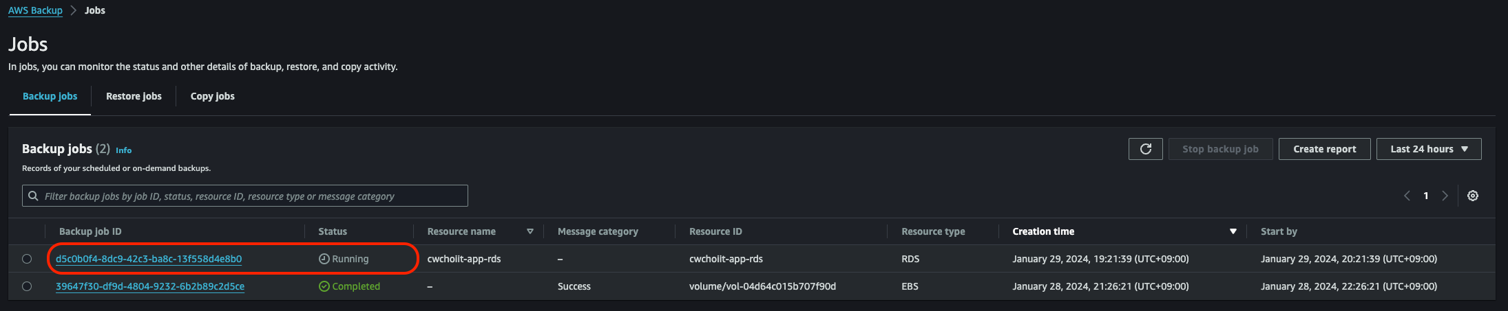 이렇게 설정한 후 백업을 만든다. 그러면 Job 리스트에서 백업이 진행중인 것을 확인 가능하다.