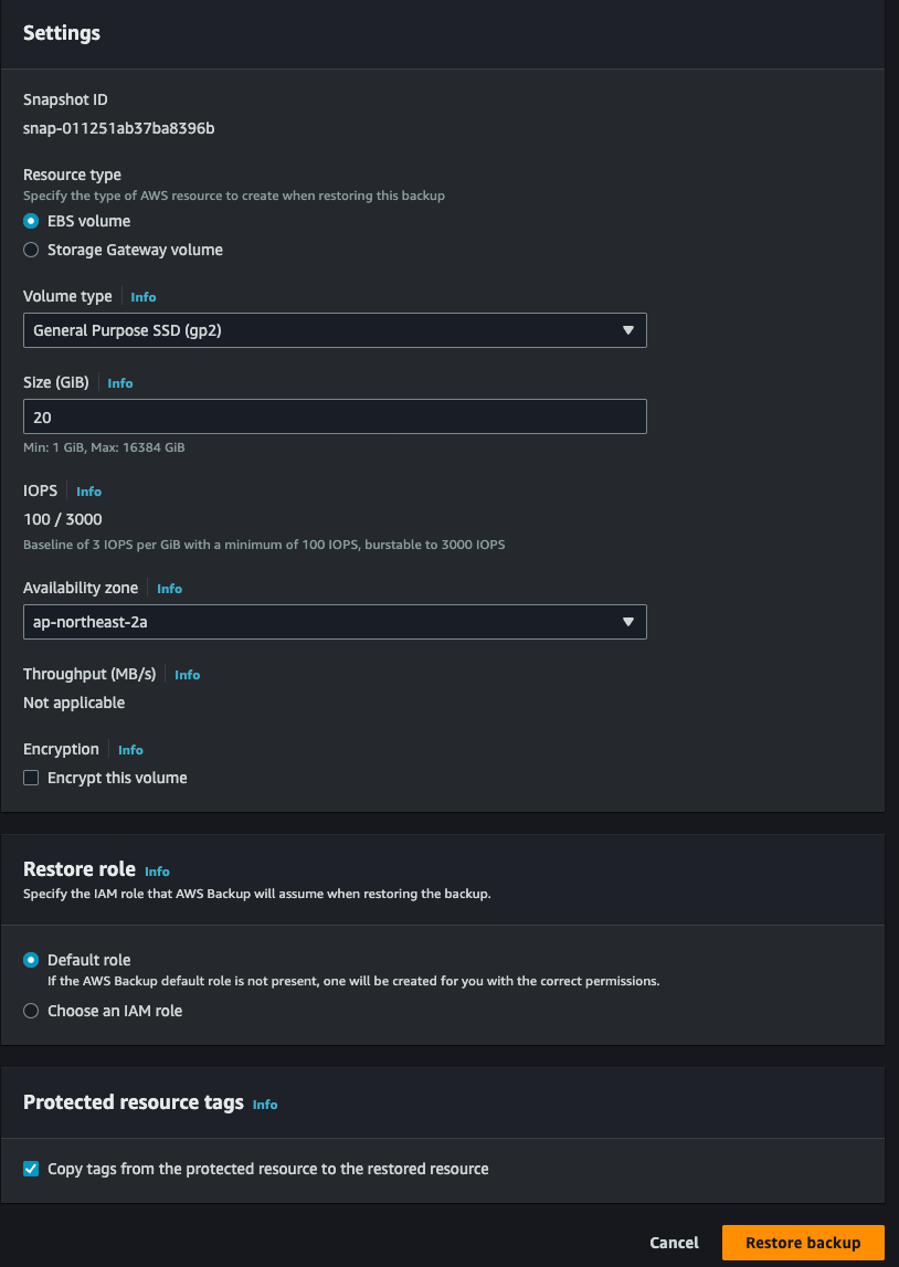 나머지는 기본값으로 세팅 후 "Restore backup" 버튼을 클릭해서 복원한다. 완료가 되면 해당 스냅샷 ID를 가져와서 EC2 > Elastic Block Store > Volume 으로 간다. (해당 스냅샷 ID는 Backup vault에서 확인 가능하다. 아래 사진 참고)