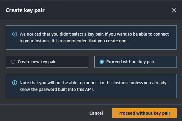 그리고 생성 버튼을 누르면 키페어 없이 생성하는게 맞냐는 안내 팝업이 뜨는데 맞다고 해주고 생성을 진행하자.